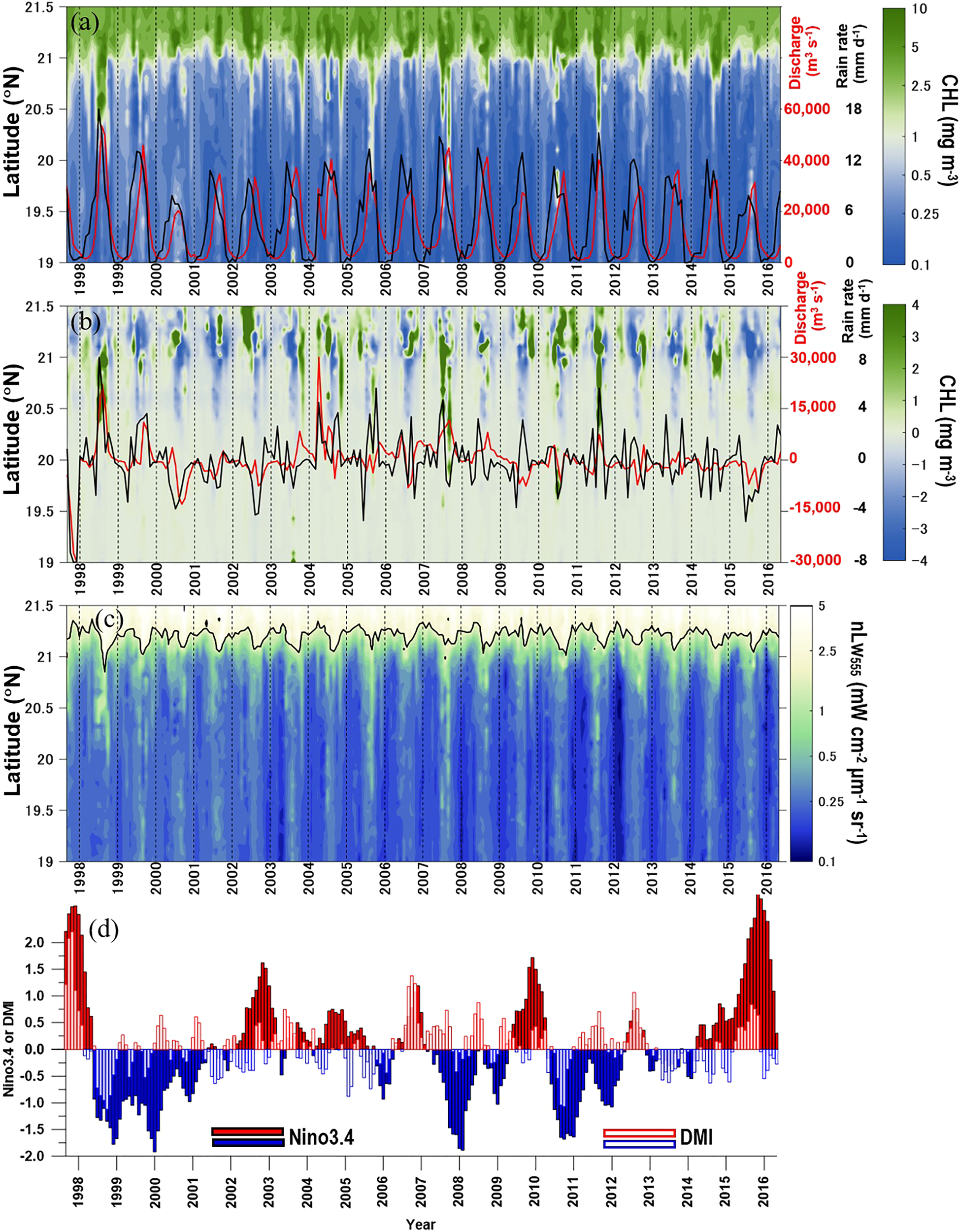 Time series of (A) CHL meridional variations along the white dashed transect line in Figure 1A. Panel (B) is the same as panel (A), except that it shows a CHL anomaly. Panel (C) is the same as panel (A) except that it shows nLw555. The red and black lines in (A) are time series of GBR discharge and rain rate, respectively. The red and black lines in (B) show the anomalies in GBR discharge and rain rate. The black contour line in (C) indicates the satellite-retrieved normalized water-leaving radiance at a wavelength of 555 nm (nLw555) of 2.5 mW cm−2 μm−1 sr−1. The time series of Nino3.4 and DMI are shown in (D) to indicate climate variations of the El Niño/Southern Oscillation and Indian Ocean Dipole.