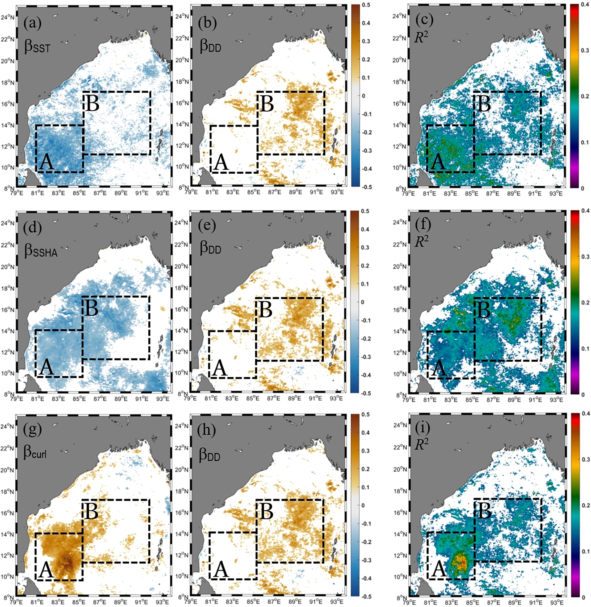 Spatial variations of (A) βSST, (B) βDD, and (C)R2 obtained from a multiple linear regression analysis with CHL as the dependent variable and SST and dust deposition (DD) as independent variables (i.e., CHL = f[SST, DD]). Panels (D, E), and (F) are the same as (A–C), except that CHL = f(SSHA, DD). Panels (G, H), and (I) are the same, except that CHL = f(curl, DD). Areas where β values were insignificant at the 95% confidence level (p-value >0.05) are masked out (white areas). Yellow (blue) areas in the panels indicate significant positive (negative) associations between CHL and the independent variables. Black dashed box A indicates the part of the southwestern bay where the time series of SST, curl, CHL, and SSHA were extracted from and are presented in Figures 4B, C. The dashed box B indicates the central/eastern bay where the time series of CHL, SST, DD, curl, and SSHA were extracted and are presented in Figures 4D, E.