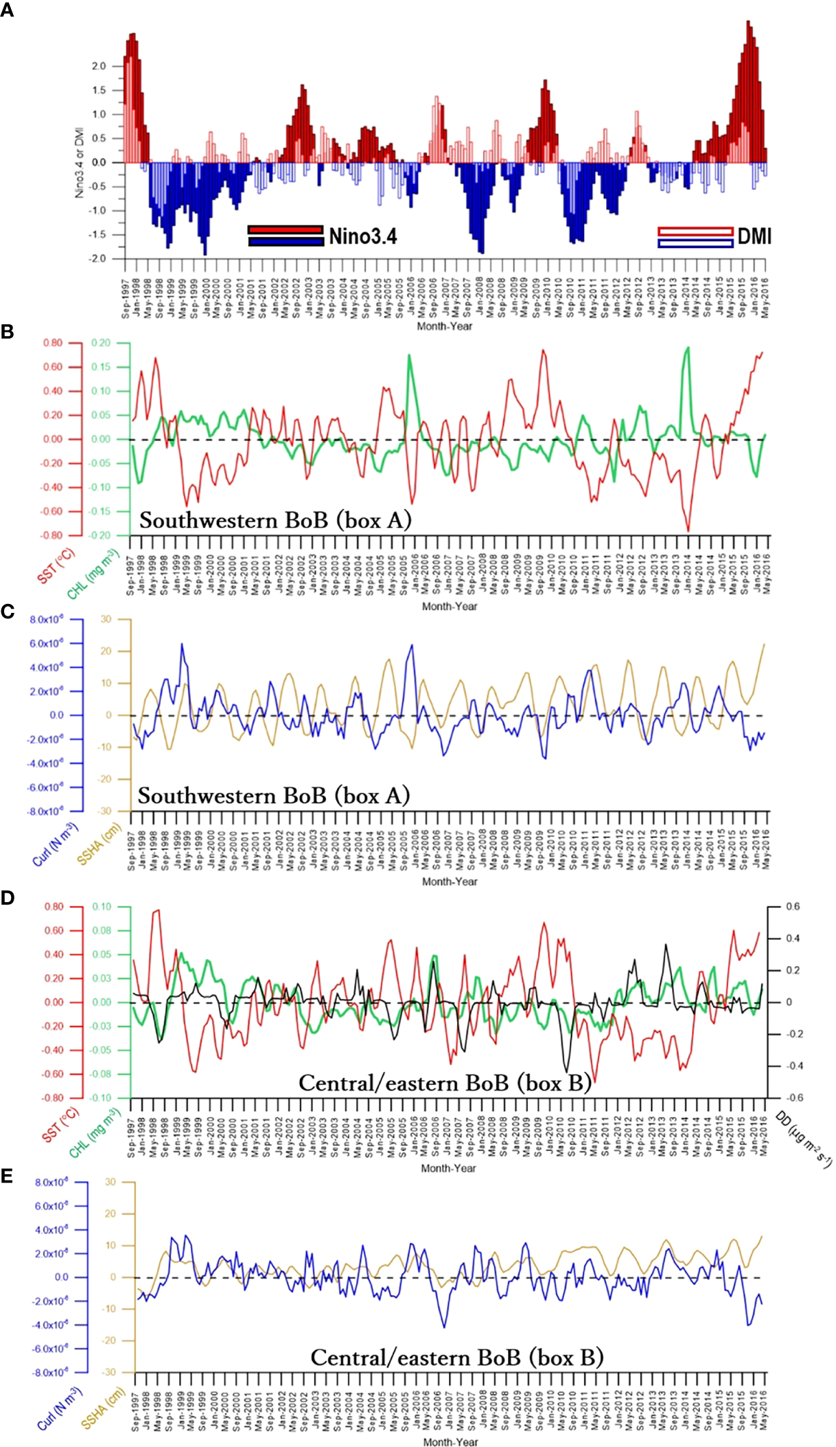 (A) Time series of Nino3.4 (closed bars) and DMI (open bars) to be compared with time series of (B) CHL and SST, and (C) curl and SSHA extracted from box A (see Figure 3) in the southwestern bay. Panels (D, E) are time series of SST, CHL, DD, curl, and SSHA extracted from box B (see Figure 3) in the central/eastern bay.