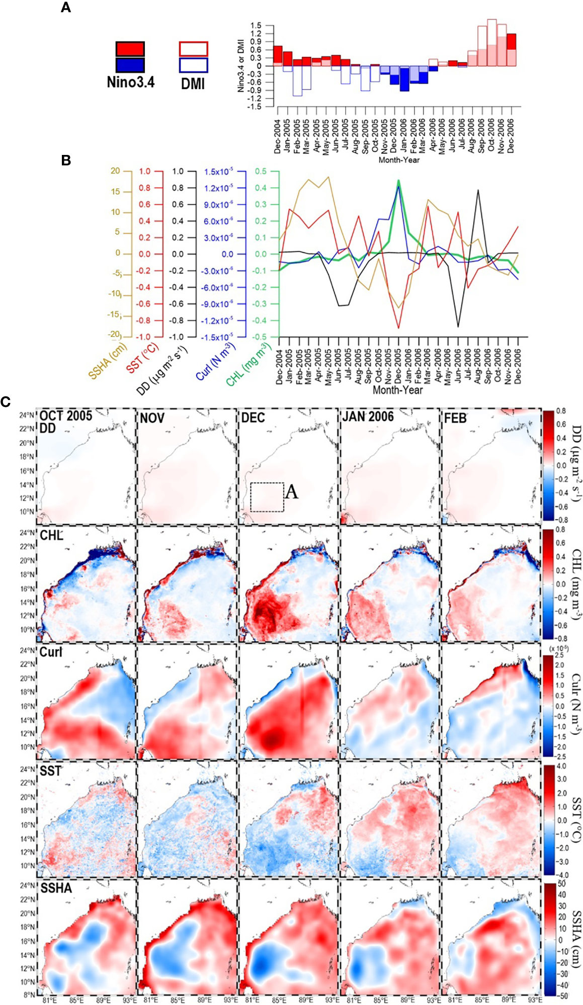 (A) Time series of Nino3.4 and DMI during the period from December 2004 to December 2006. Within that period, panel (B) shows time series of SSHA, SST, DD, curl, and CHL extracted from box A panel (C)-1st row) in the southwestern bay. Panel (C) shows maps of DD (1st row), CHL (2nd row), curl (3rd row), SST (4th row), and SSHA (5th row) for the period from October 2005 to February 2006.