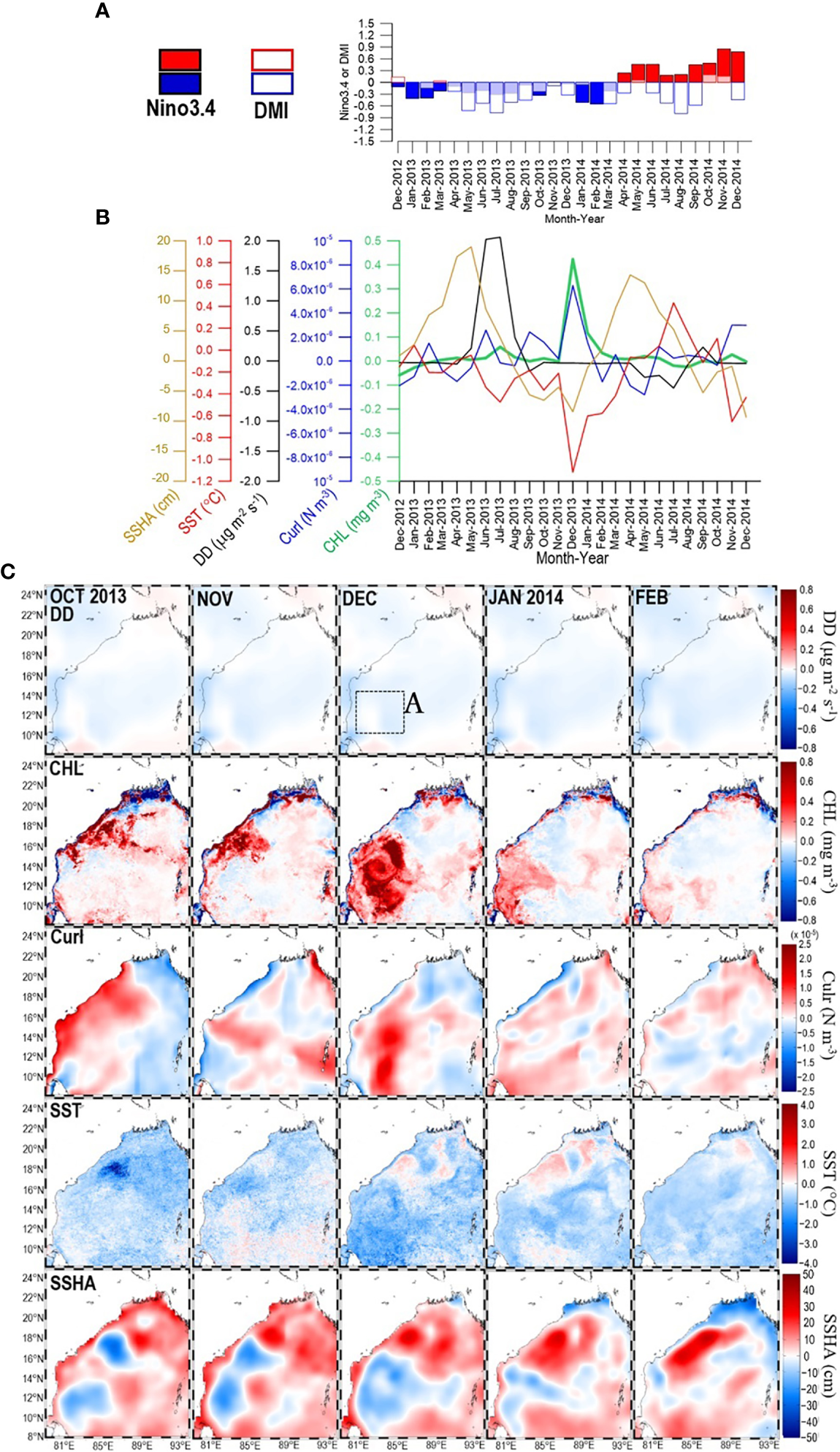 (A) Time series of Nino3.4 and DMI during the period from December 2012 to December 2014. Within that period, panel (B) shows time series of SSHA, SST, DD, curl, and CHL extracted from box A panel (C)-1st row) in the southwestern bay. Panel (C) shows maps of DD (1st row), CHL (2nd row), curl (3rd row), SST (4th row), and SSHA (5th row) for the period from October 2013 to February 2014.