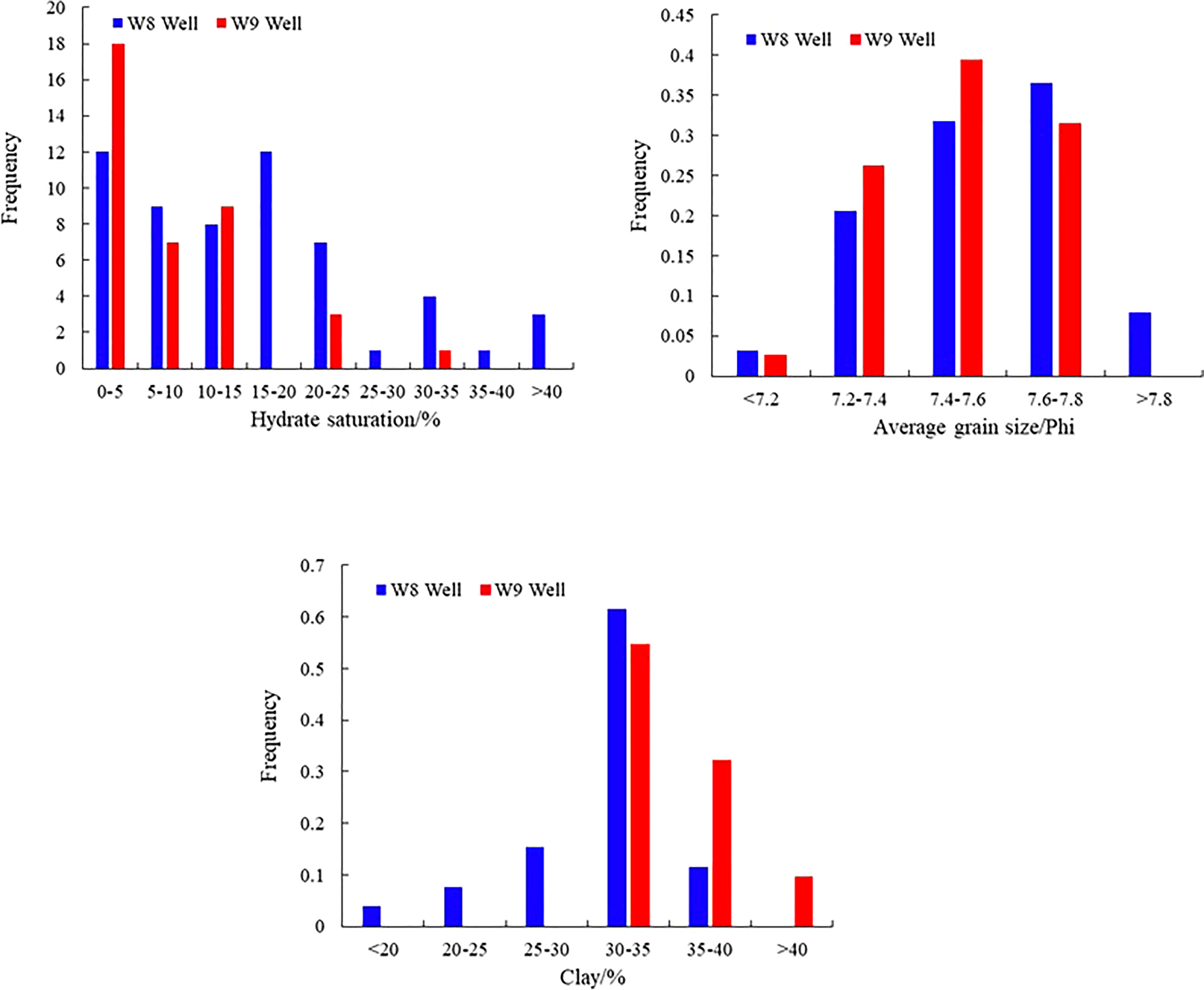 Here, to verify the reliability of the method, we use the data from well W8 to build a model and predict the reservoir types of both well W8 and well W9. Previous studies have found that in hydrate-bearing sedimentary formations in the Qiongdongnan Basin, the enrichment of hydrates is mainly related to porosity, clay content, grain size, and pore structure (Deng et al., 2021; Wu et al., 2021; Wang et al., 2022). When the porosity of the formation is larger, the pore structure tends to be simpler, and natural gas is more easily trapped in the pores to form hydrates. An increase in the clay content can increase the capillary pressure in the pore space, preventing natural gas from further entering the pores and reducing the formation of natural gas hydrates (Wang et al., 2022). In addition, an increase in the clay content can reduce the growth space of hydrates by filling the pores, further increasing the difficulty of hydrate formation (Li et al., 2021a; Li et al., 2022b). Moreover, when the reservoir is dominated by fine-grained sediments, the complexity of the pore structure, especially the reduction in the pore size, can also increase the difficulty of hydrate formation (Li et al., 2021b; Wang S. et al., 2021).