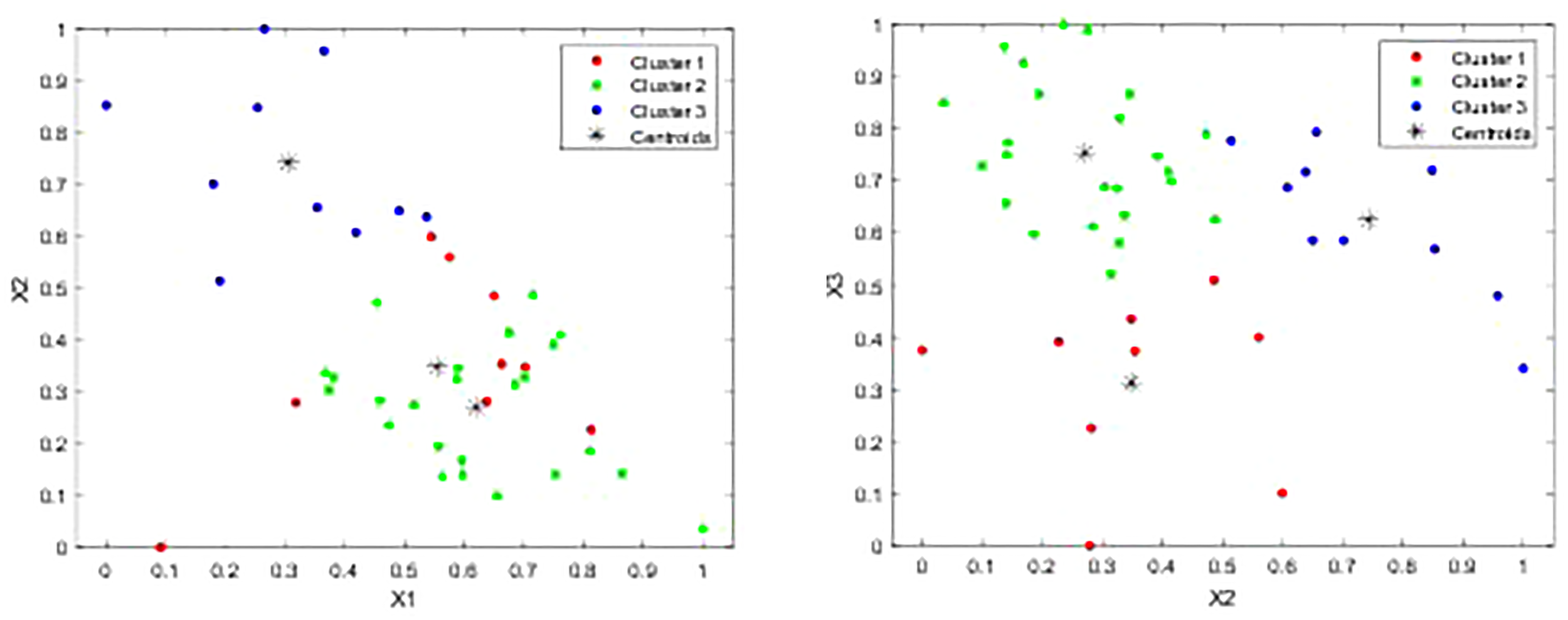 Shows the clustering results. X1 represents the normalized clay content, X2 represents the normalized porosity, and X3 represents the normalized average grain size. From the clustering results, the relationship between the clusters and X2 and X3 is stronger.