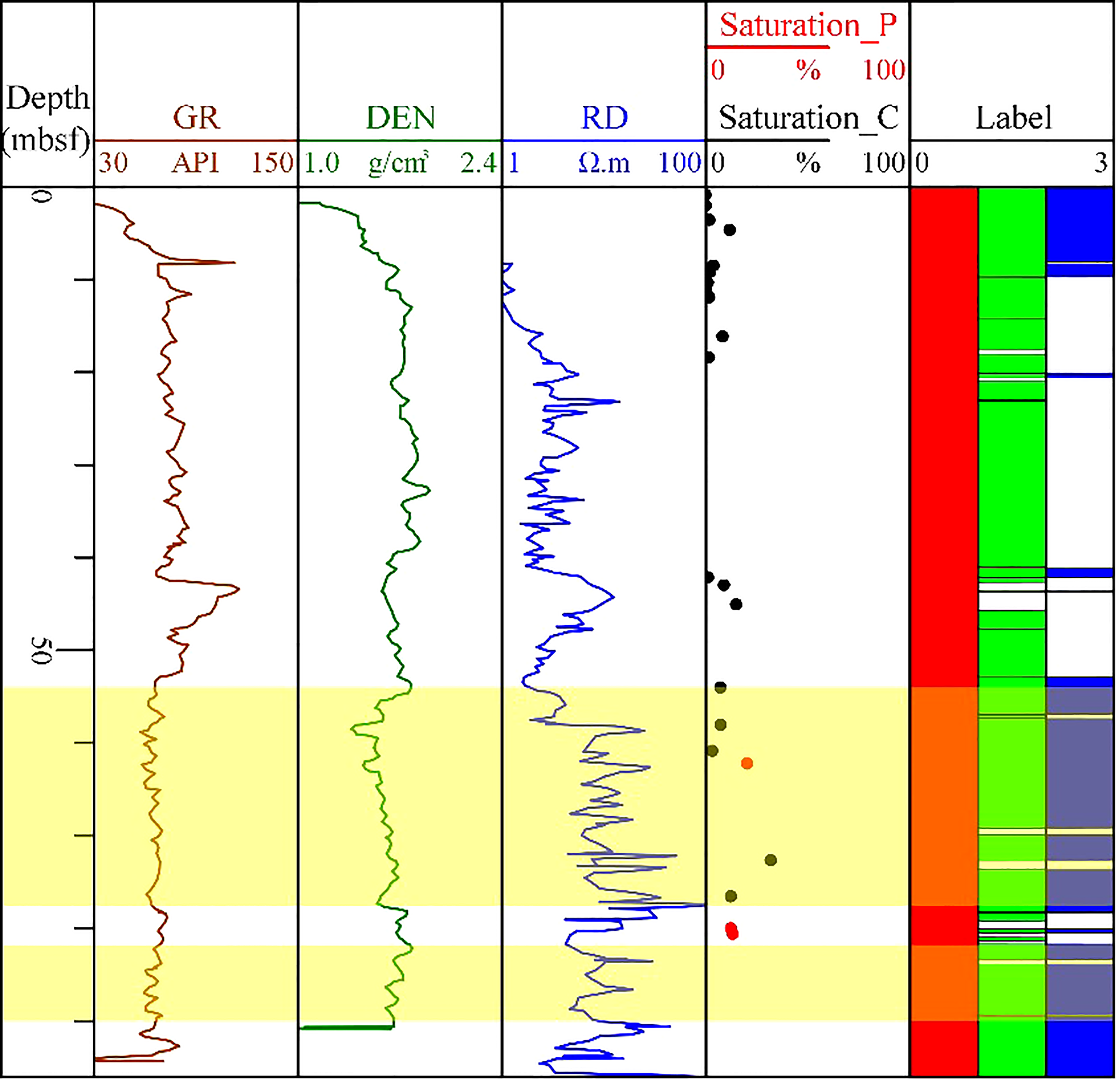 | Depth | Vclay | Porosity | Average grain size | Label | Depth | Vclay | Porosity | Average grain size | Label |