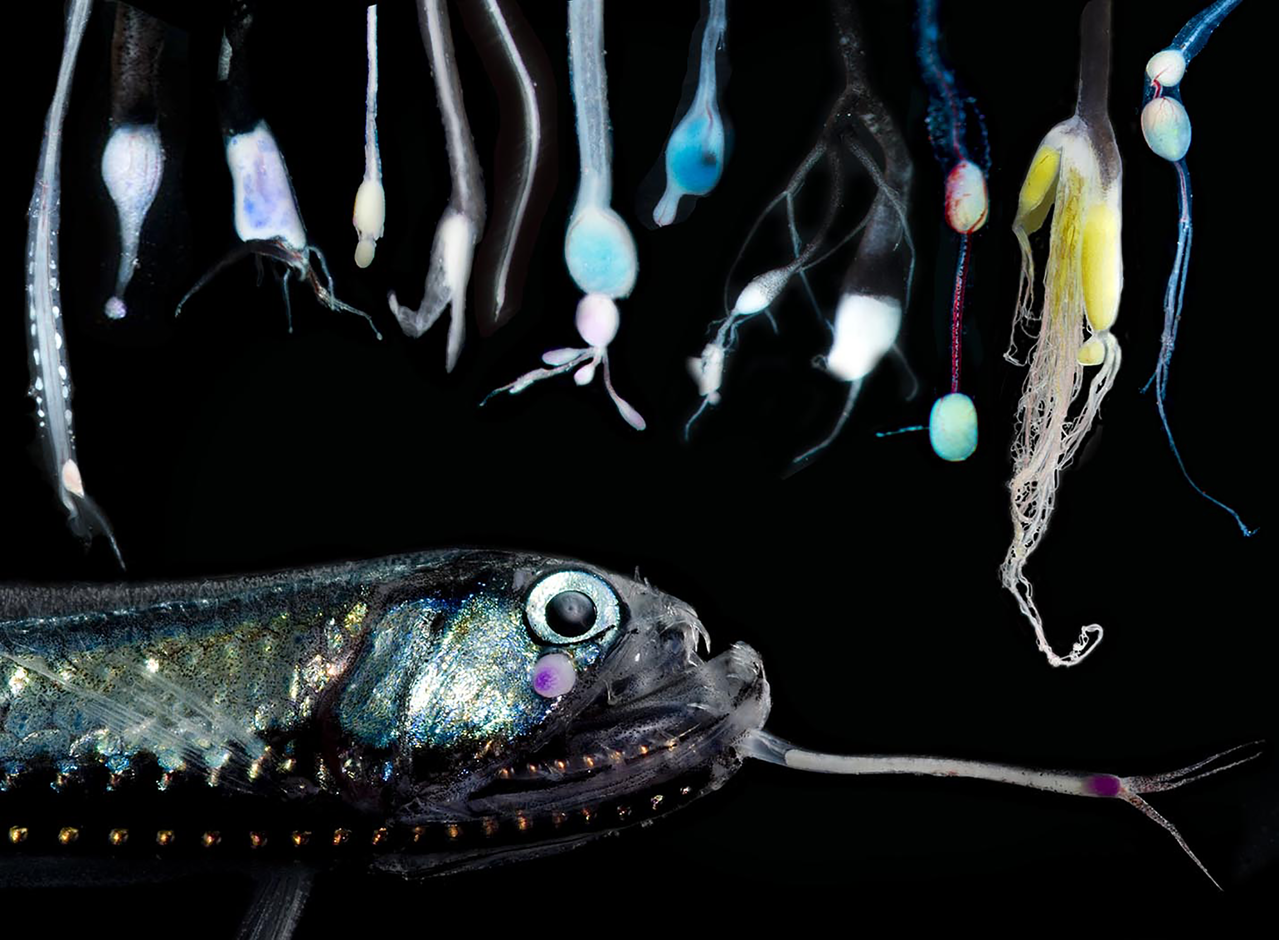 Examples of morphological variation in the barbels of dragonfishes. Clockwise from upper left corner to right: Melanostomias biseriatus, Photonectes leaucospilus, Photonectes margarita, Flagellostomias boureei, Melanostomias tentaculatus, Bathophilus pawneei, Echiostoma barbatum, Eustomias lipochirus, Eustomias fissibarbis, Eustomias hypopsilus, Eustomias schmidti, Eustomias bimargaritatus, and Stomias affinis (fish at bottom).