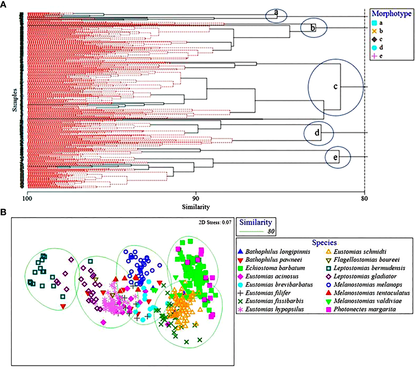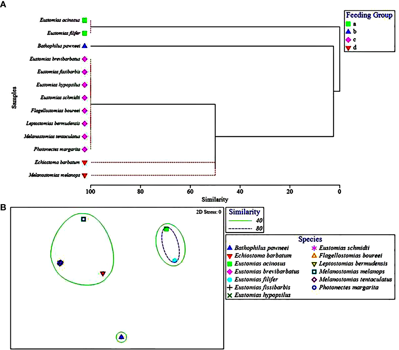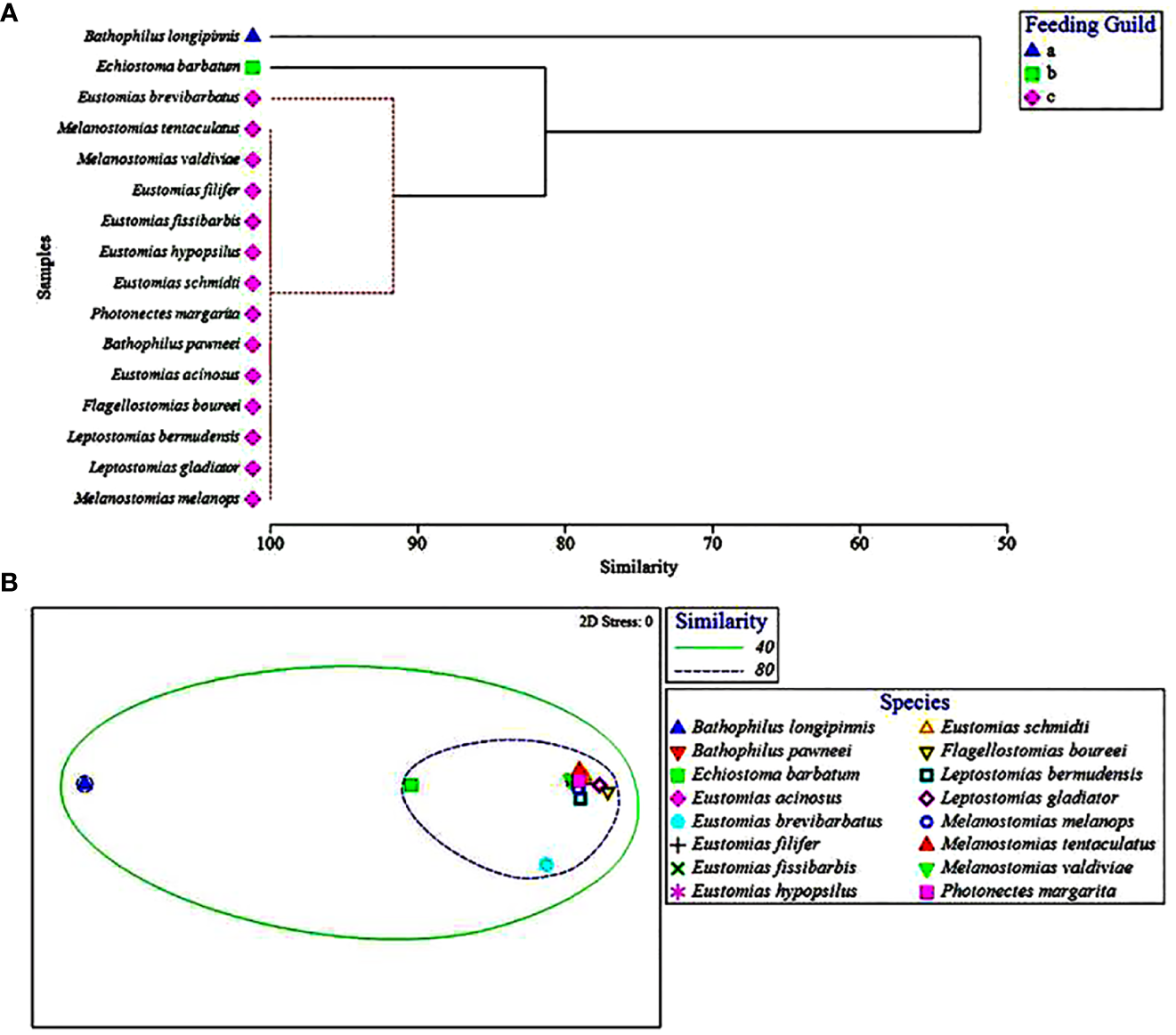 All statistical analyses were performed using the program PRIMER (v. 7.0.13; PRIMER-e (2017), Quest Research Limited). For analyses, a Bray-Curtis similarity index (Bray and Curtis, 1957) was computed after standardizing feeding data as a percentage of all prey items. Two multivariate techniques, (1) an unweighted pair-group method using arithmetic averages (UPGMA; Romesburg, 1990) cluster analysis and (2) non-parametric multi-dimensional scaling (MDS; Kruskal and Wish, 1978), were used to group melanostomiines into feeding guilds. Prey type was analyzed at two levels: 1) Infraclass or higher (Vertebrata, Crustacea, Cephalopoda, Annelida, Chaetognatha, Tunicata, Urochordata, Cnidaria, Ctenophora, and Sipuncula); and 2) Family for teleost consumers. For morphological analyses, a Bray-Curtis similarity index was computed using ratio values of morphological measurements. Similar to the trophic analyses, UPGMA clustering and non- parametric MDS analyses were also conducted to group melanostomiines into morphotypes. Groupings within each treatment (feeding and morphology) were defined by graphical (visual) concordance of the two analyses (UPGMA and MDS) (Sutton et al., 2008). In order to determine the morphological-dietary relationships of melanostomiines, graphical concordance of the treatment groupings was assessed using the same method.