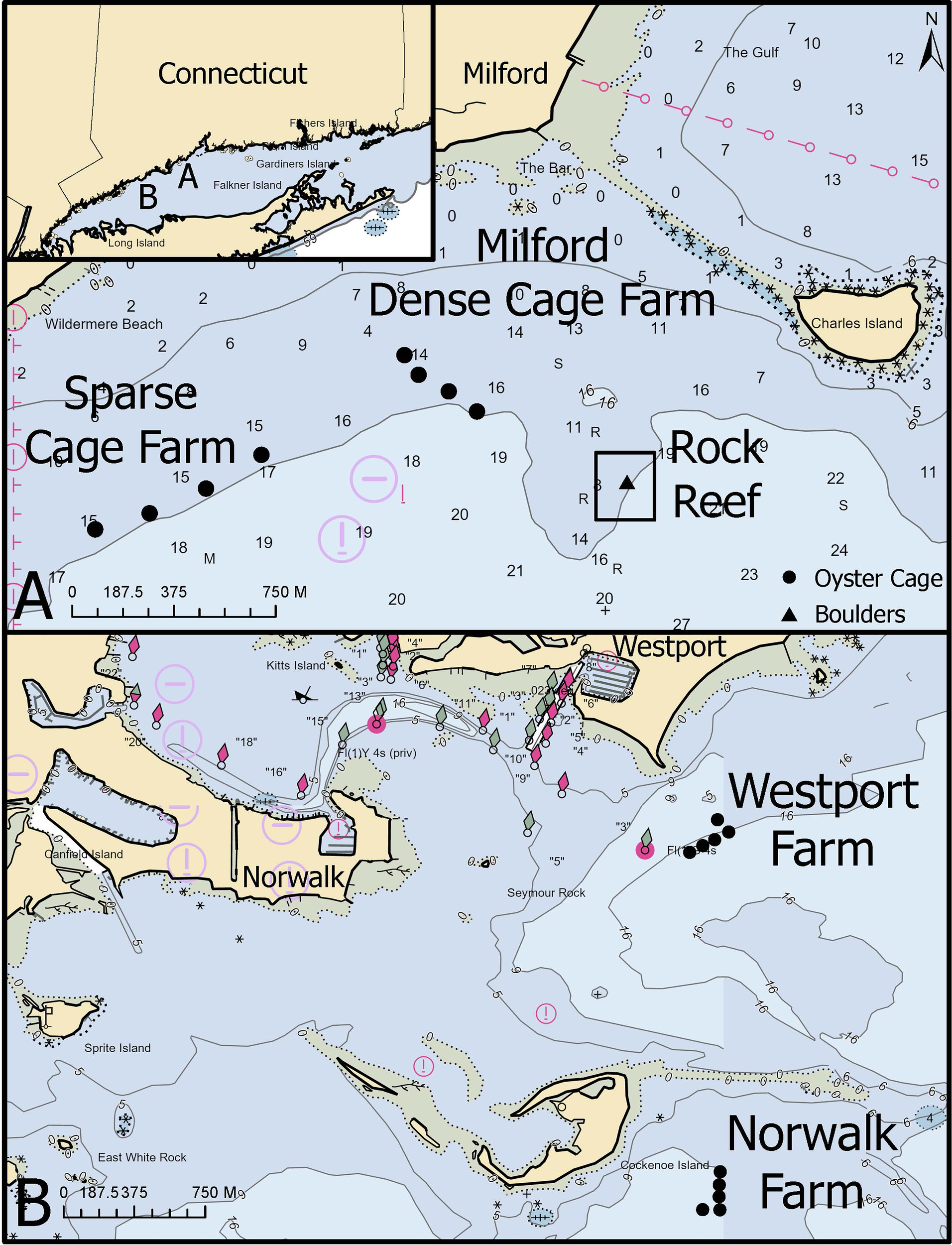 To assess fish interactions with aquaculture gear relative to natural structure, we studied shellfish farms with high (dense) and low (sparse) cage abundance versus boulders on a rock reef. Three study sites were located in the same embayment west of Charles Island, near Milford Connecticut, within central Long Island Sound (Figure 1A). The dense cage farm site, with 40-100 commercial cages, was located on a 0.11 km2 (27.2 acres) shellfish lease, permitted for up to 200 off-bottom cages. An adjacent 0.25 km2 (61.8 acres) lease, permitted for up to 250 off-bottom cages, was co-located at the dense cage farm site. As these were working farms, the number of cages in the area varied on any particular day and across the season and limited our ability to test the effect of specific cage density itself. Four study cages were placed at the dense cage farm site and cages were spaced 47.5 m (156 ft) apart.