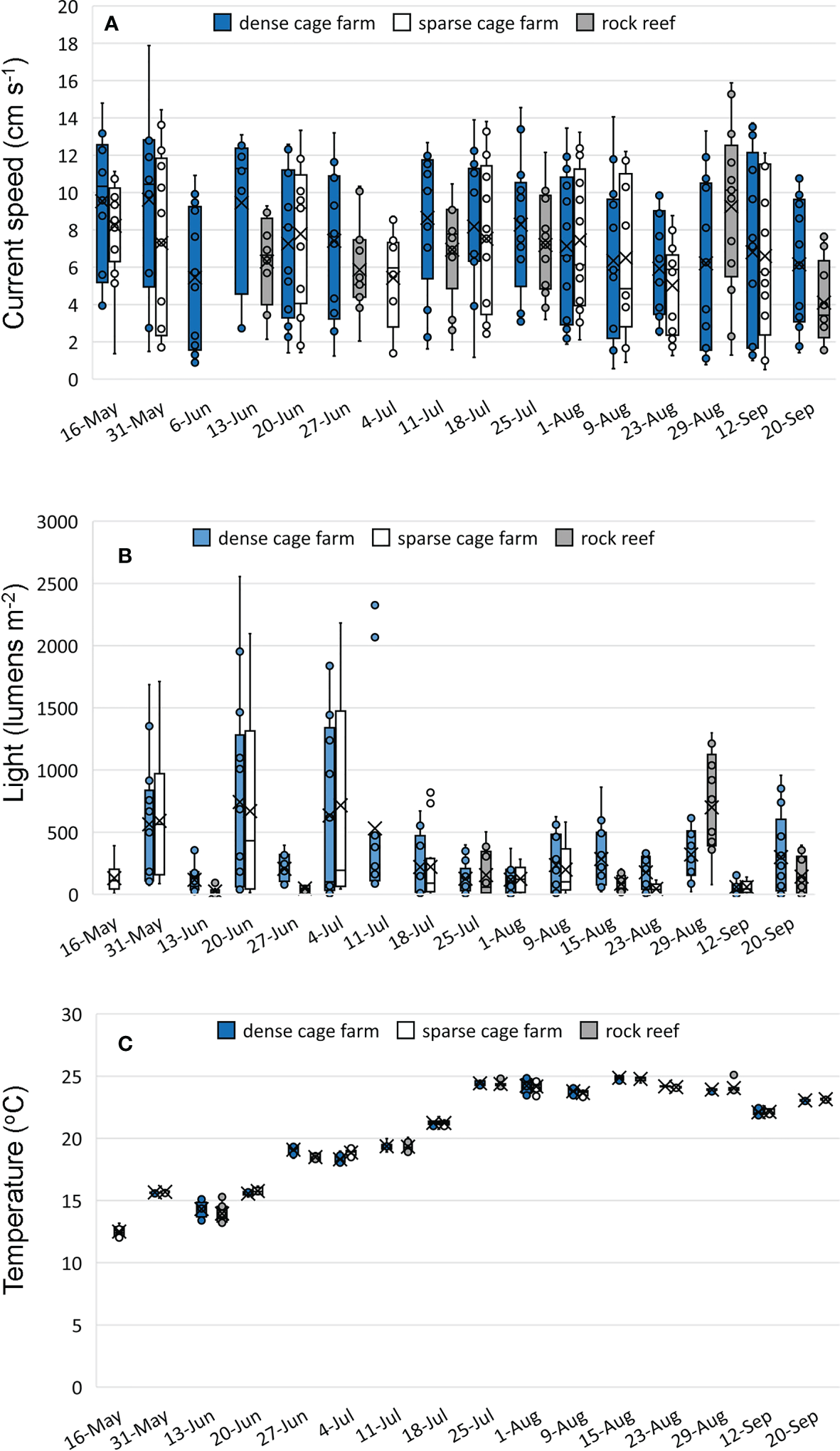 | Date | Dense cage farm | Sparse cage farm | Rock reef |