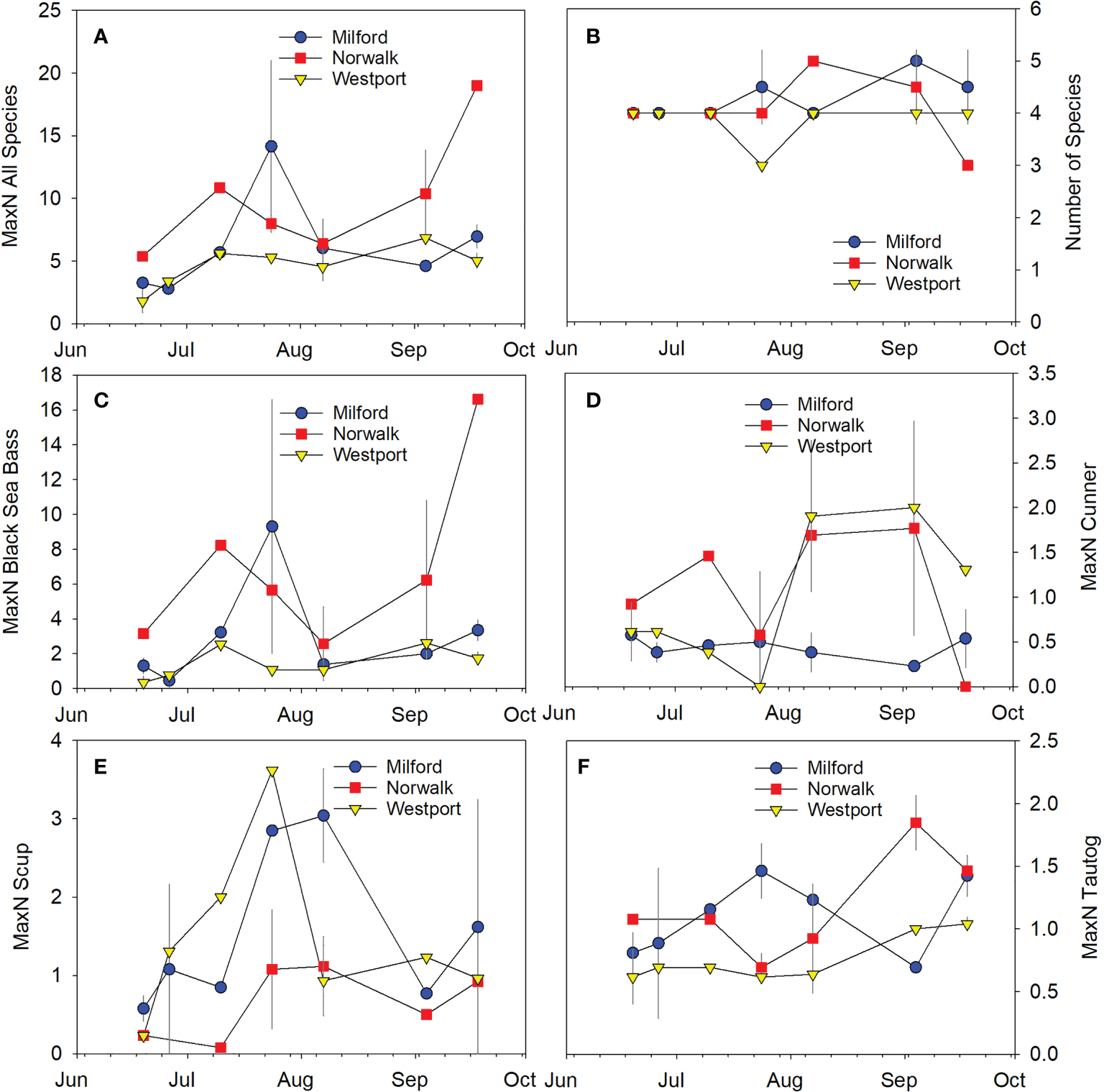 Time series of fish abundance and species richness at the dense cage farm, sparse cage farm, and rock reef sites between May and September 2018. Symbols indicate mean ± SD. (A) Total fish abundance across all species, (B) Species richness, (C) Black sea bass, (D) Cunner, (E) Scup, (F) Tautog.