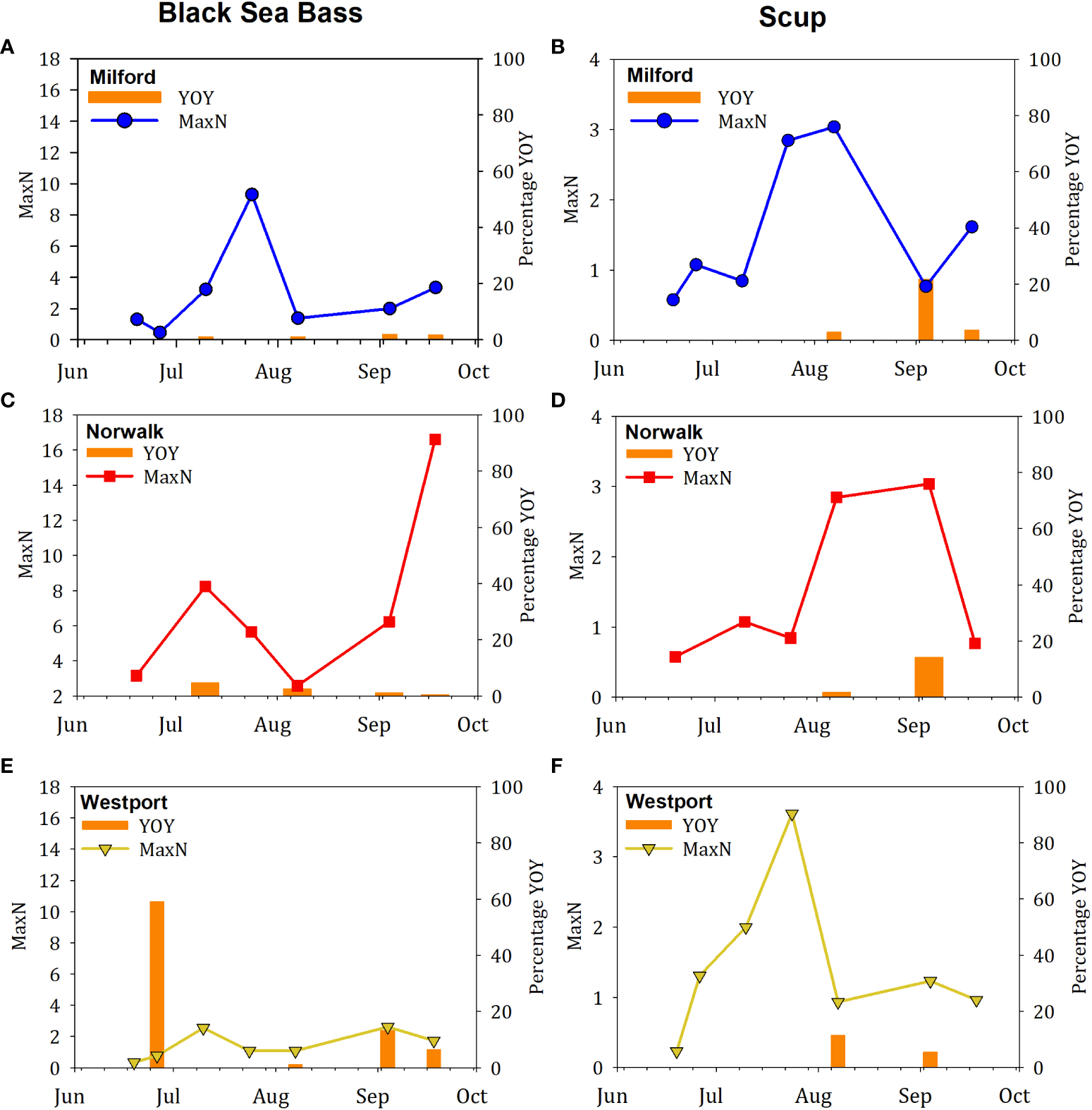 Young-of-year (YOY) fish were observed for 6 of the 17 total fish species recorded in 2018: black sea bass, cunner, scup, tautog, hake, and menhaden (Table 3). YOY black sea bass and scup were observed on both habitats and in all three locations; YOY tautog were observed on the two cage sites but not the rock reef site; YOY cunner, hake, and menhaden were observed on the dense cage farm only. The species for which YOY were observed most frequently and at highest abundance were black sea bass and scup (Figure 4). This life history stage was only observed late in the season, beginning in early August, and continuing through the final sampling date in September. While we note overall trends here, we opted not to perform statistical analysis of this more limited dataset, since YOY were only observed on a few sampling dates. On dates for which YOY were recorded, the mean percentage of black sea bass observed that were YOY was 27% on the dense cage farm, 20% on the sparse cage farm, and 67% on the rock reef (Figures 4A, C, E); mean percentage for scup was 61% on the dense cage farm, 16% on the sparse cage farm site, and 35% on the rock reef (Figures 4B, D, F). Maximum YOY black sea bass abundance on dates where YOY were recorded was 10 at the dense cage farm, 6 at the sparse cage farm, and 4 at the rock reef; max YOY scup abundance was 73 at the dense cage farm, 8 at the sparse cage farm, and 16 at the rock reef (Table 3).