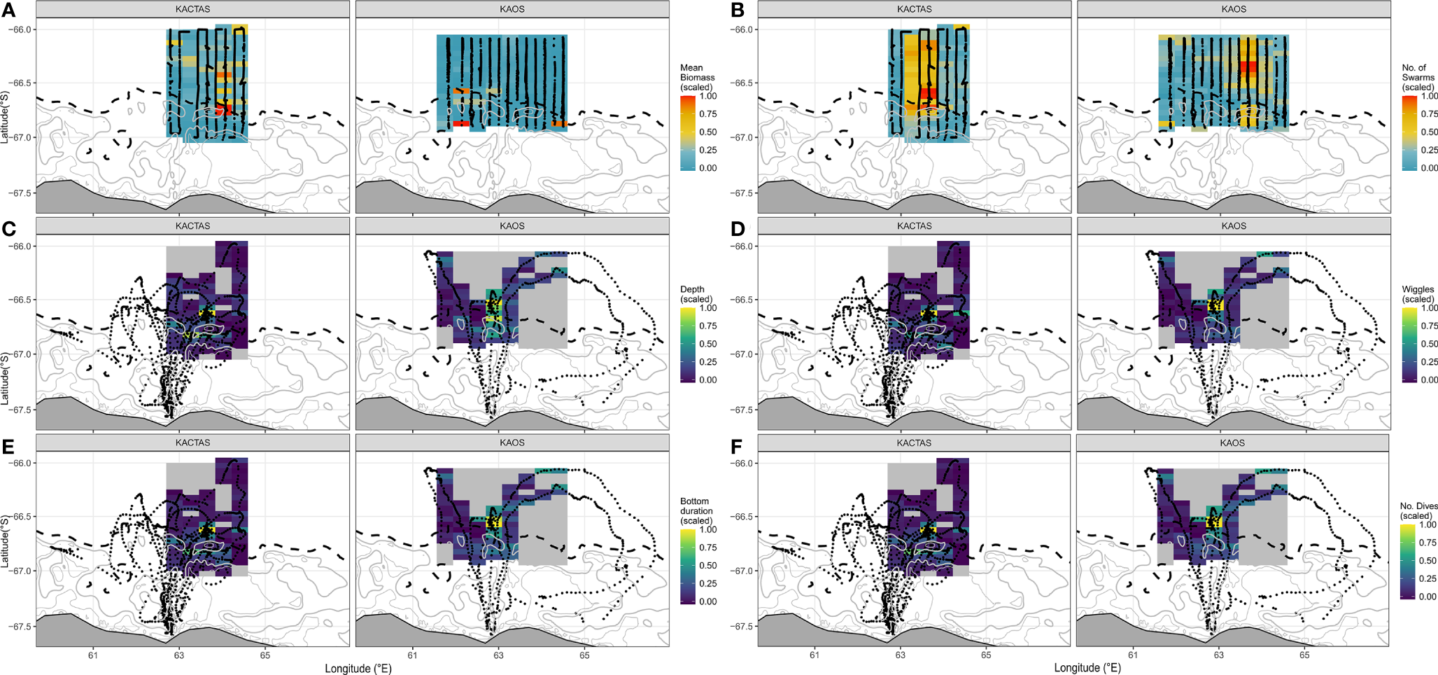 Maps displaying the distribution of krill metrics (mean biomass and number of swarms) and four penguin diving metrics (depth, wiggles, bottom duration and # of dives) over the KACTAS and KAOS survey area. Grid cell metrics are binned at a 0.05˚ latitude x 0.38˚ longitude spatial resolution. The black points represent krill transect (A, B) and penguin tracking observations for krill and penguin plots (C–F), respectively. Maps displayed illustrate spatially grided predator-prey data, as inputed into models. Land and bathymetric features are displayed as per Figure 1.