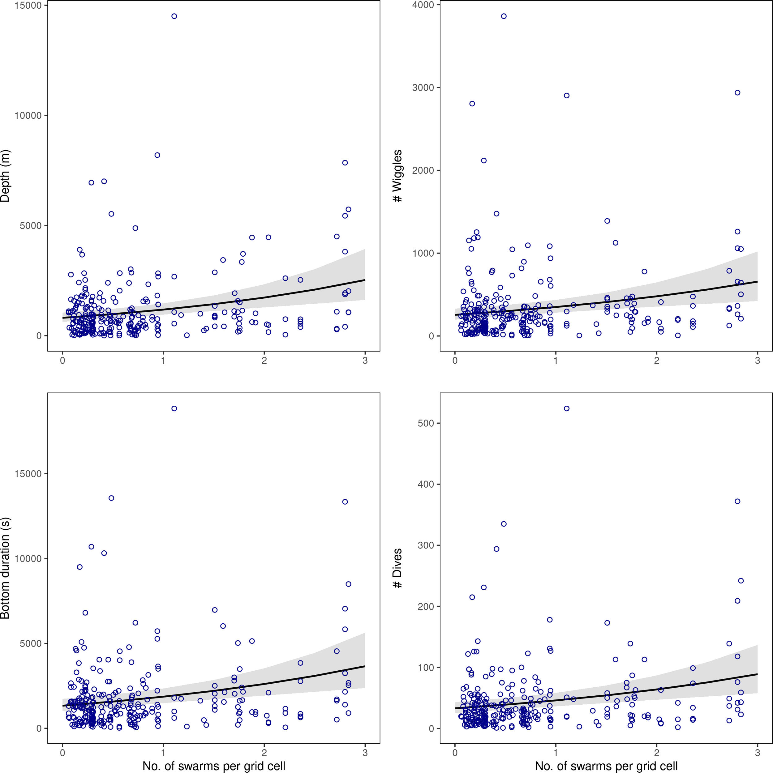The total depth and bottom duration travelled, and number of wiggles and dives performed were consistently greater in areas where there were a higher number of krill swarms. In contrast, penguin foraging effort was not significantly related to mean swarm biomass in any model (Table 4; Figure 4).