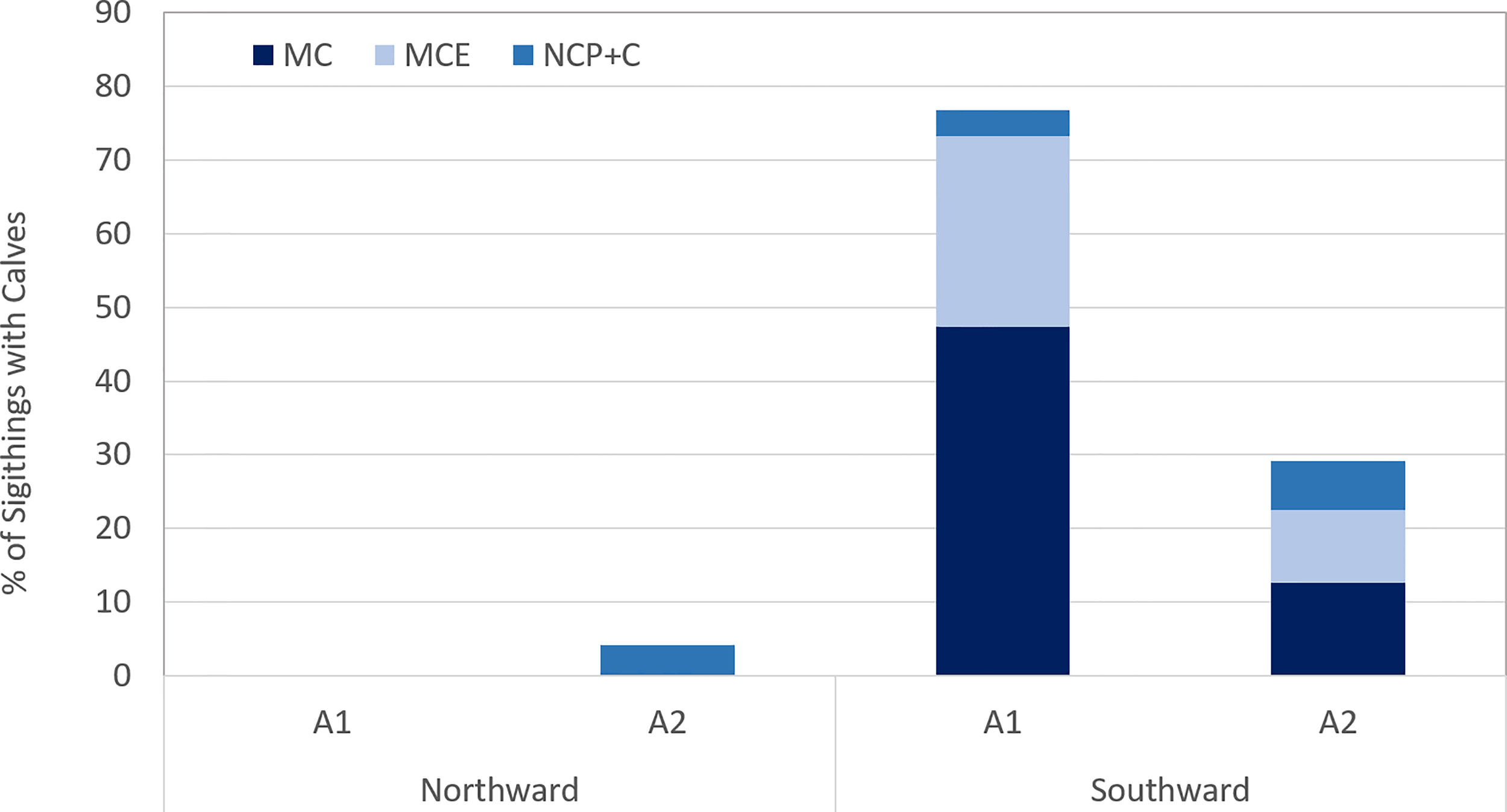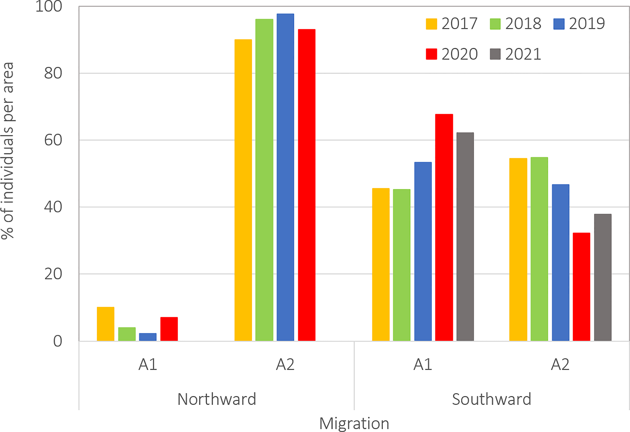 On an area-corrected basis, the proportion of individuals observed in each area, during the five-year survey period, were as follows: on the northward migration, Area 1 animals corresponding to 3.66% of individuals observed during this period. By contrast, on the southward migration, individuals observed in Area 1 rose to 42.41% of individuals recorded during the migration.