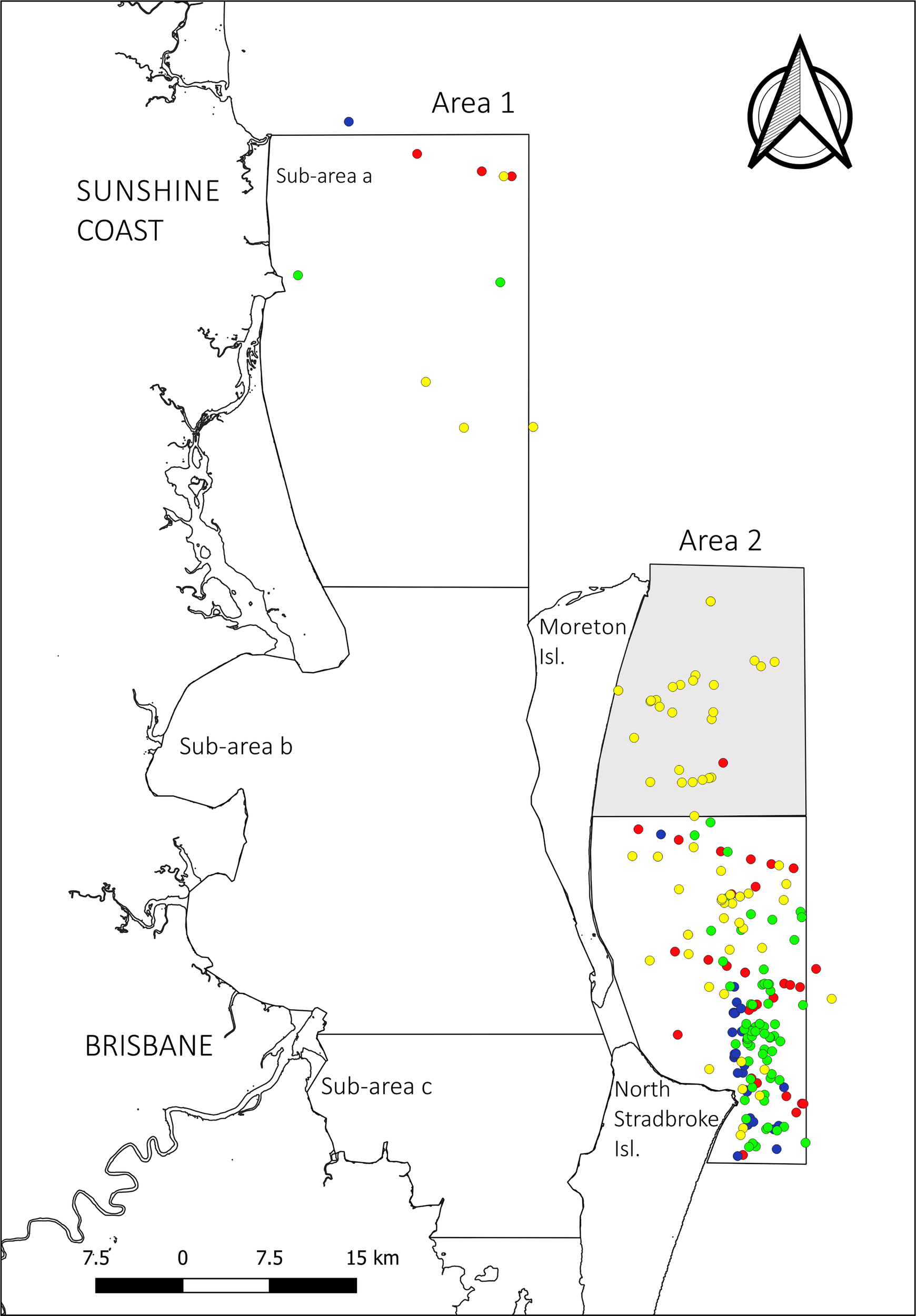 In order to explore localised habitat use, Area 1 was divided into three sub-areas (Figure 1). Sub-area a, with an area of 853 km², represents the northern part of Area 1, stretching from Mooloolaba to Moreton Island. Although part of this area belongs to Moreton Bay Marine Park, it extends beyond the enclosed bay area into open water with an ocean depth of more than 30 m. The area also encompasses the northern part of the shipping channel which traverses the bay from Mooloolaba to the Brisbane River mouth (90 km) and is dredged to maintain a minimum depth of 14 m. Sub-area b with an area of 1,076 km², covers the northern part of the Moreton Bay embayment stretching from the top of Moreton Island to the Port of Brisbane. This area is characterized by shallow waters with a depth from 1 to 15 m and encompasses the southern part of the shipping channel. Sub-area c with an area of 357 km², represents the southern part of Moreton Bay, with very shallow waters ranging from 1 to 10 m. This area does not include any part of the shipping channel, although coincides with the ferry routes of several vehicle and passenger ferries and is also the area with greatest recreational boating activity.