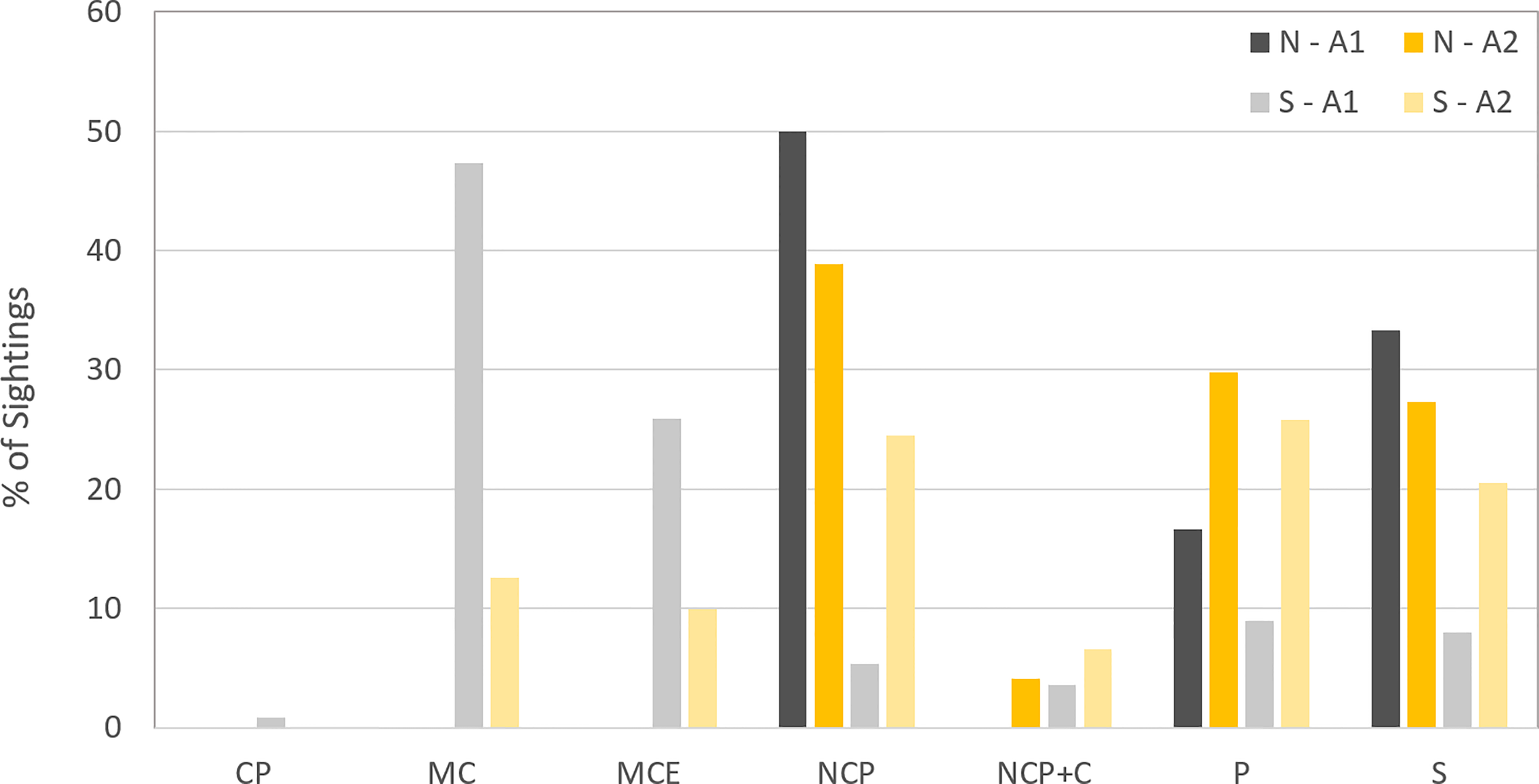 During the northward migration, a total of 18 individuals across 10 sightings were observed in Area 1. This number rose to 397 individuals across 200 sightings on the southward migration in gross number terms.