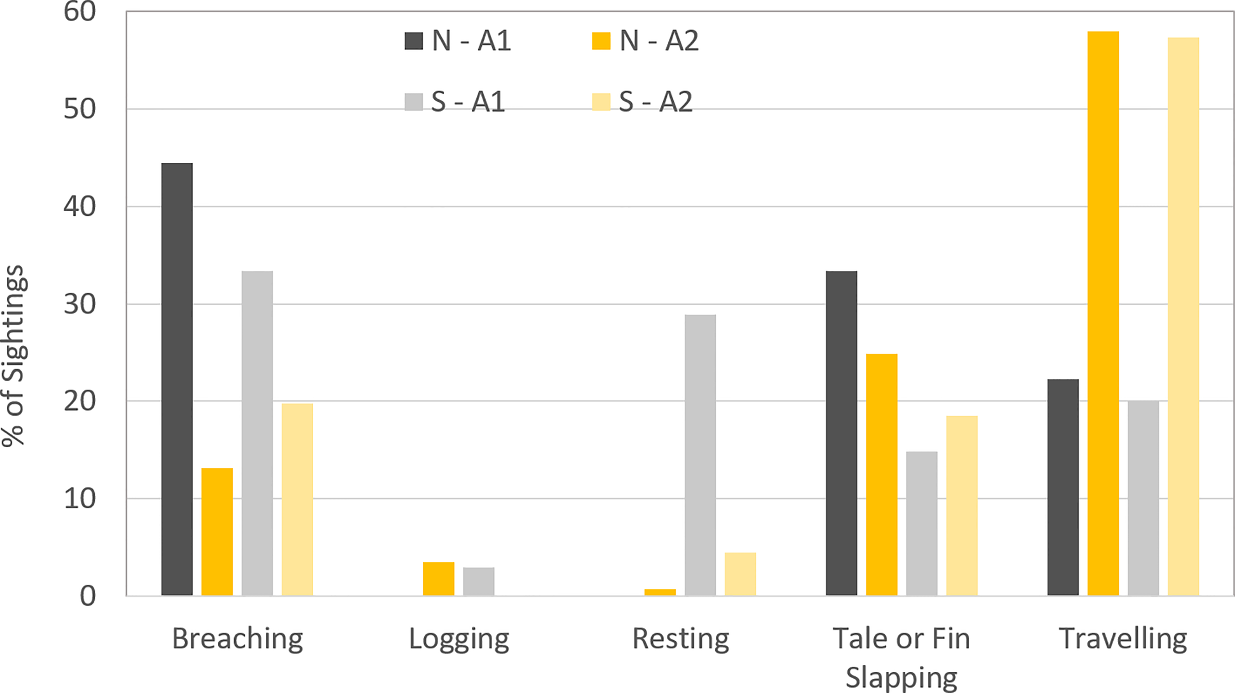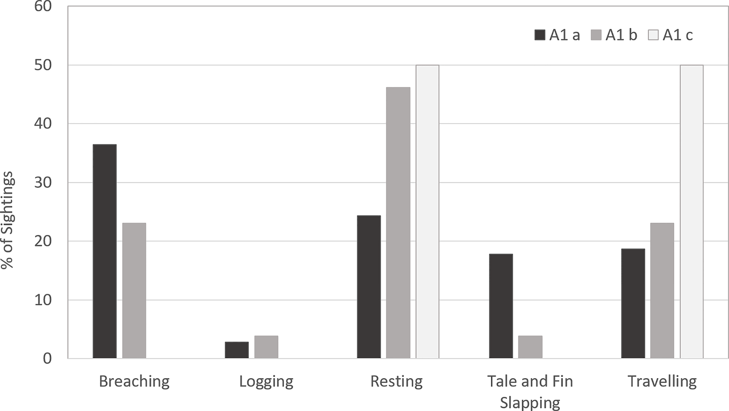 For the purpose of representation, tail and fin slapping have been given the combined code of TFS due to the uncertainty in distinguishing differences from a greater distance.