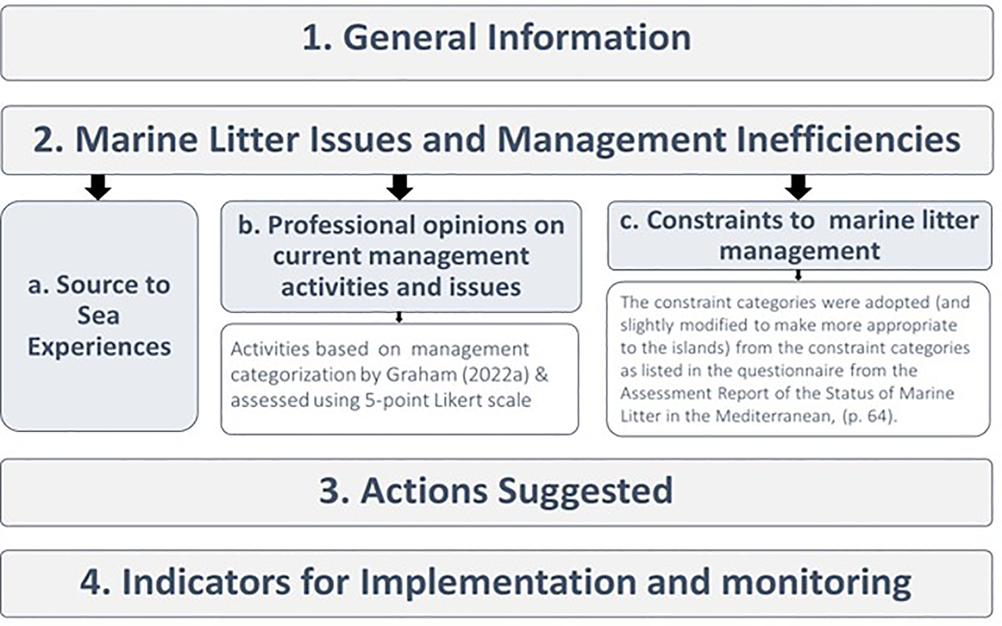 The surveys (see Supplementary information) aimed to capture both existing on-the-ground responses to marine debris or lack thereof and the perspectives of national policy makers and key policy influencers on priorities and relevant solutions for the prevention, reduction and mitigation of the marine debris problem in the context of their country. The survey was composed of four sections including general information about the participants’ current position, current marine litter issues and management inefficiencies, actions needed to prevent or reduce marine litter and its impact and management activities indicators for implementation and monitoring (Figure 1). The survey was published on an online platform called Formsite.