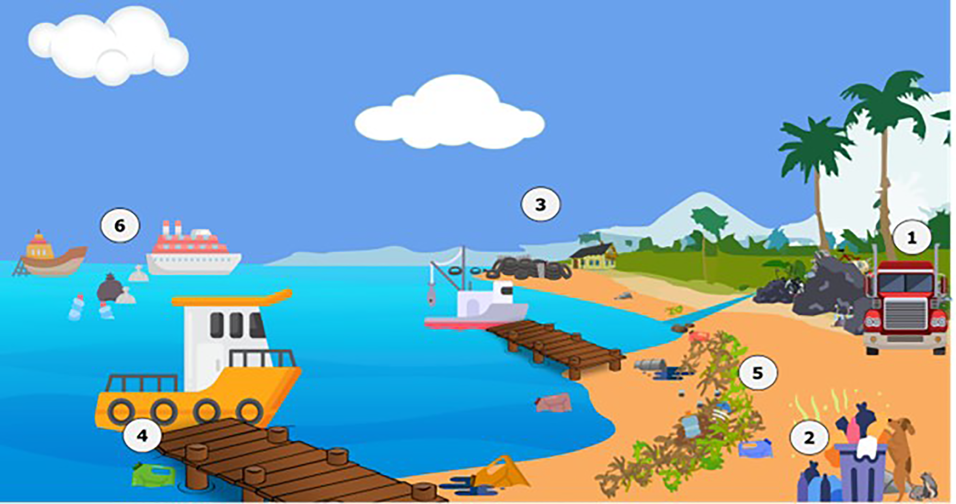 An illustration of marine litter issues based on the observations shared by participants (for country-specific details refer to supplementary information). Some of the land to sea experiences are linked to solid waste management issues, including 1. illegal dumping on or near coast and rivers, and 2. overwhelmed trash cans (also tied to insufficient trash cans and inadequate collection efforts) resulting in inappropriate disposal of trash by the public, and the encouragement of stray and wild animals to ‘rummage’ and spread trash. Usually, overfilled trash cans can be observed near drainage systems. 3. The haphazard use of old tires (among other debris) to serve as coastal barriers because of sea level rise and consequent erosions and flooding. 4. Inappropriate disposal of engine oil bottles by fishermen. Ocean based experiences included 5. Debris entrapped in Sargassum, whether the debris is transboundary or from the mainland or both, remains to be investigated. 6. Illegal dumping and discharges by ships.