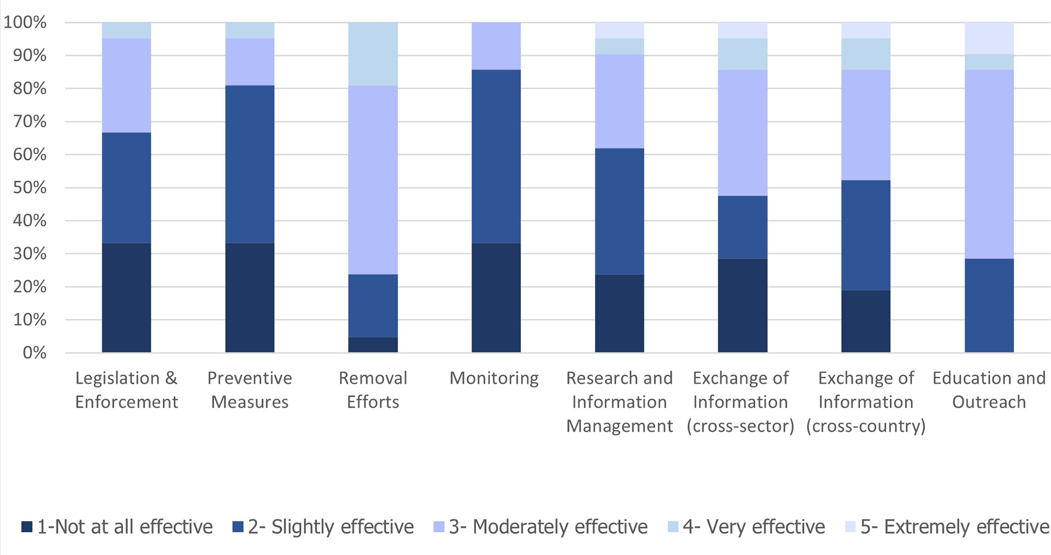 It is important to note that none of the participants was of the opinion that legislation and enforcement, preventive measures, removal and monitoring are extremely effective. Further, monitoring received the lowest effectiveness score overall. One third of (1/3) the participants’ professional opinion is that current monitoring strategies and activities are not at all effective, and the remaining two thirds (2/3) are of the opinion that monitoring measures (if they exist) are not quite effective and reporting is lacking. All of the participants agree (with 67% of the participants strongly agreeing) that monitoring can go beyond just monitoring of debris removal, but monitoring of the other management activities (e.g., effectiveness in prevention measures, legislation, progress in research and information management) for providing updated quality status reports, supporting a recommendation coming out from a review by Graham (2022a). Another noteworthy result is that all of the participants claimed that current education and outreach measures have some level of effectiveness, the greater majority indicating that such measures have been moderately effective.