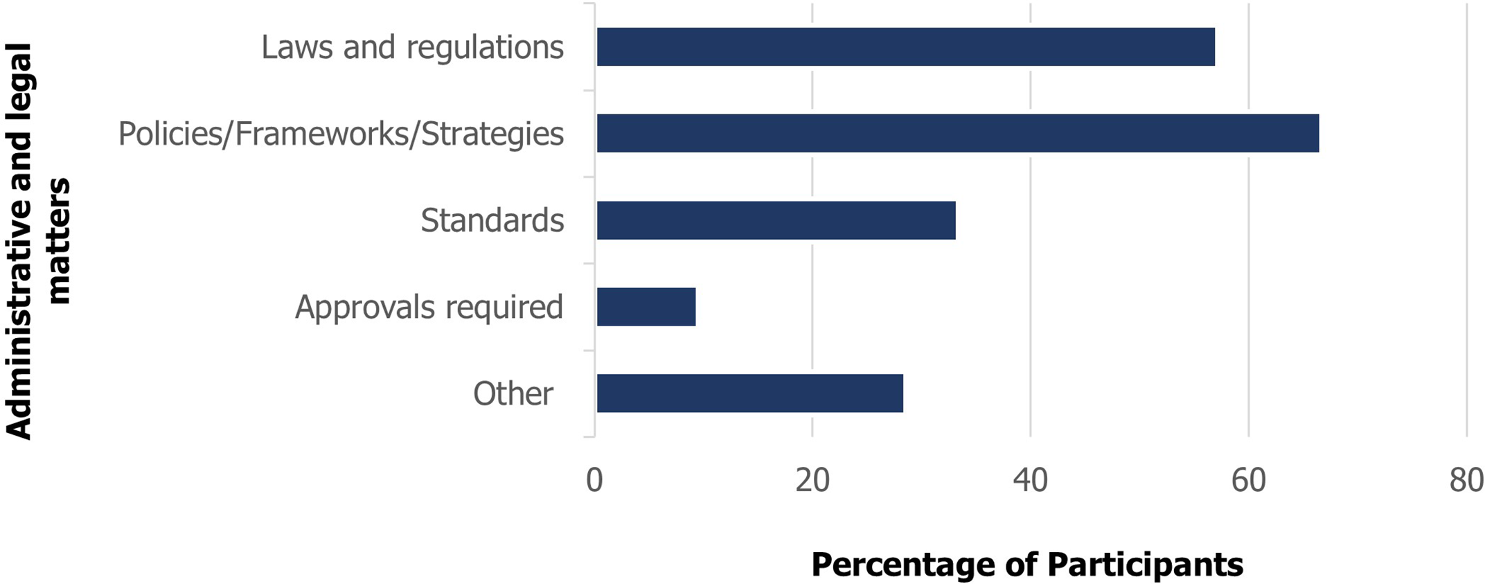 In terms of administrative and legal matters, a greater majority of participants (67%) are of the opinion that the lack of marine litter policies is the major constraint that prohibits sound coastal and marine litter handling. This is a given since the islands do not yet have their individual national marine debris policy (Figure 6). This is followed by inadequacies of laws and regulations as well as associated enforcement and compliance mechanisms (57%), which participants also included in the ‘Other’ choice option. Thirty-three percent (33%) of participants chose standards issues as a top three constraint and agreed that it is impossible to have a common synthesis of data collected due to the fact that each debris removal and count initiatives within and across islands are conducted with different standards. This included differing data cards used, and measurements taken (number of items versus weight of debris versus both), while certain pertinent information could be missing (e.g. length and type of coast cleaned and the proximity of coast to sources of litter).