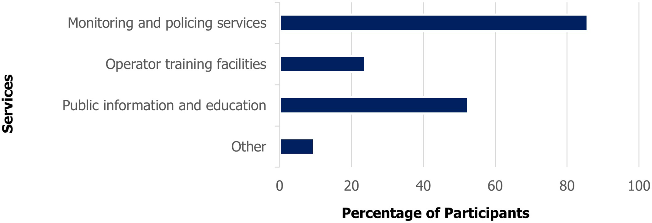 Eighty-six percent (86%) of the participants agree that the major constraint that prohibits sound waste management and coastal and marine litter handling, in terms of support services, is monitoring and policing (i.e. enforcement and compliance) measures (Figure 8). Inefficiencies in public information and educational outreach is also identified as a main constraint (52%).
