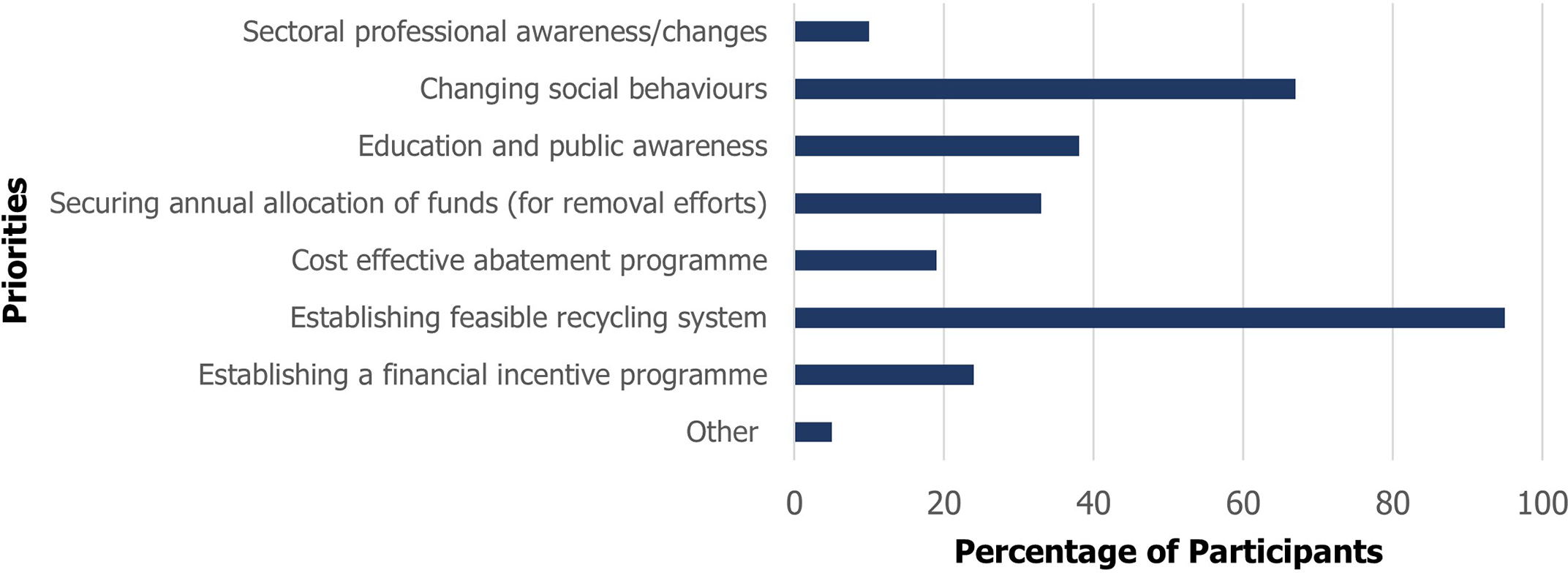 Participants were asked what the top three (3) national priorities should be for enabling on-the-ground actions for better coastal and marine litter prevention and reduction. Establishing feasible recycling systems (i.e., from collection, processing, remanufacturing and or exportation) was the top choice for 95% of the participants. This is a major research finding with respect to designing mitigation measures. This was followed by changing social behaviors (67%) (which includes a combination of product and consumer literacy, improving disposal habits and compliance with laws and regulations) (Figure 9). The third priority included education and public awareness which in itself can feed into the other priorities. It is important to note that annual funds allocation for removal efforts closely followed suit.