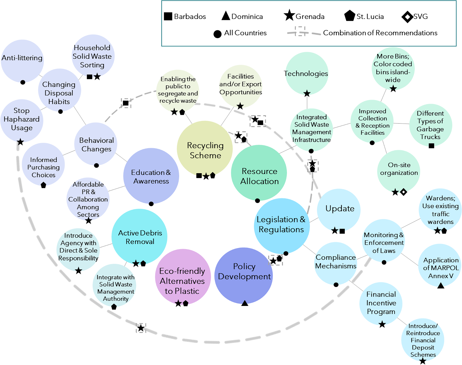 To date, the islands remain in policy drafting stage, some transitioning from SWM policy to developing ISWM policy and projects, including Grenada (Government of Grenada, 2022) and Barbados (Government of Barbados, 2021), with estimations reflected in their national budgets. This potentially speaks volumes as to why marine debris policies have not been drafted yet as indicated by Graham (2022a). While policy drafting and revision is important, capacity building and infrastructure investment is even more important to facilitate achieving the objectives of effective SWM and ISWM. One can argue what is the point of SWM policy if you do not have the capacity and infrastructure needed for achieving the basic outcomes of SWM. Noting that solid waste management practices differ for developed and developing nations, there is still one common expectation of effective solid waste management infrastructure and facilities. This expectation is that solid waste is prevented, minimized, and systematically controlled from its generation, disposal, collection, recovery, transport, separation, landfilling, treatment, processing and compaction and ideally recycling (Modak, 2010; Bilitewski et al., 2015; Kurniawan et al., 2021; JICA, n.d.).