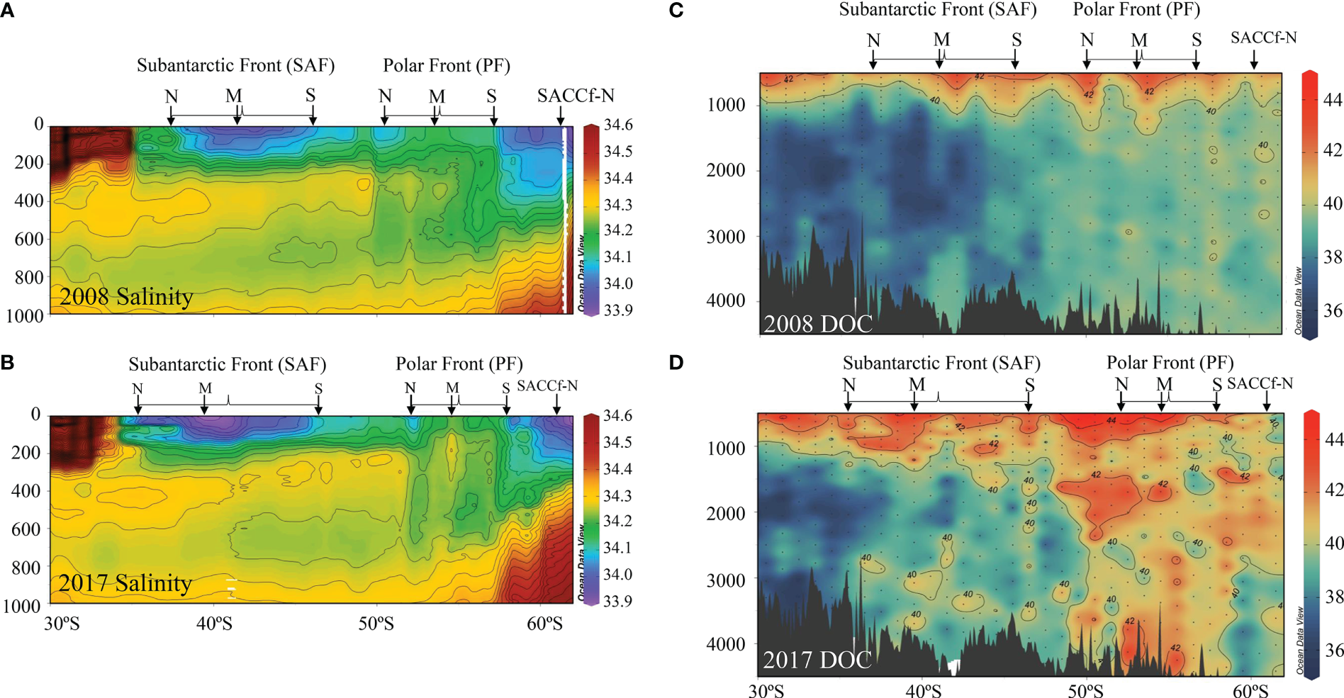 Upper ocean salinity distributions in (A) January 2008 and (B) January 2017 at 100°W ± 5° between 30-62°S that identify the latitudes of the north (N), mid (M), and southern (S) branches of the Subantarctic Front (SAF) and the Polar Front (PF). The location of the northern branch of the Southern Antarctic Circumpolar Current Front is also identified. Profiles were obtained from 265 and 665 Argo float profiles, respectively (Argo, 2021). Contours for isohalines are in 0.025 increments. DOC concentrations [µmol C kg-1] in (C) January 2008 and (D) January 2017 along transect P18.