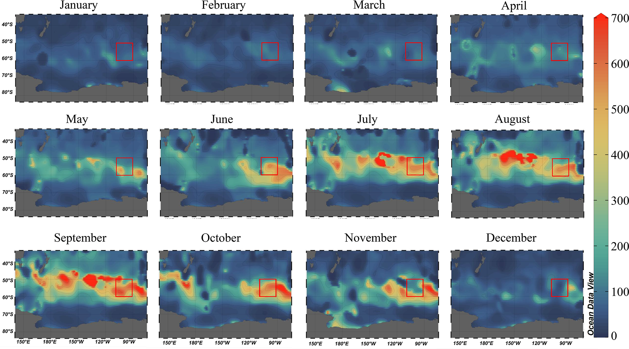 Modeled mixed layer depths from Monterey and Levitus, 1997. Mixed layer depths are calculated as the first depth in which potential density exceeds 0.125 kg m-3 of the surface density. The embedded red boxes indicate the approximate latitudes in which the widespread export event of 2017 had occurred.