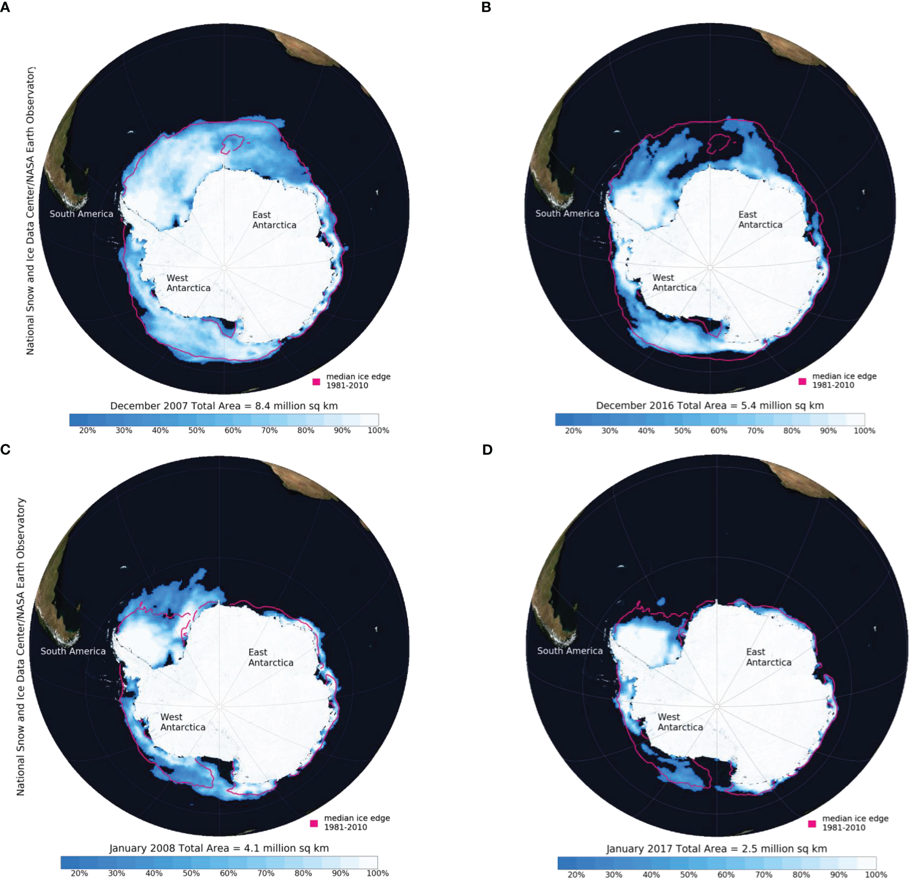 Sea ice area maps in (A) December 2007, (B) December 2016, (C) January 2008, and (D) January 2017. Percentages indicate ice concentration. Image courtesy of the National Snow and Ice Data Center, University of Colorado, Boulder.