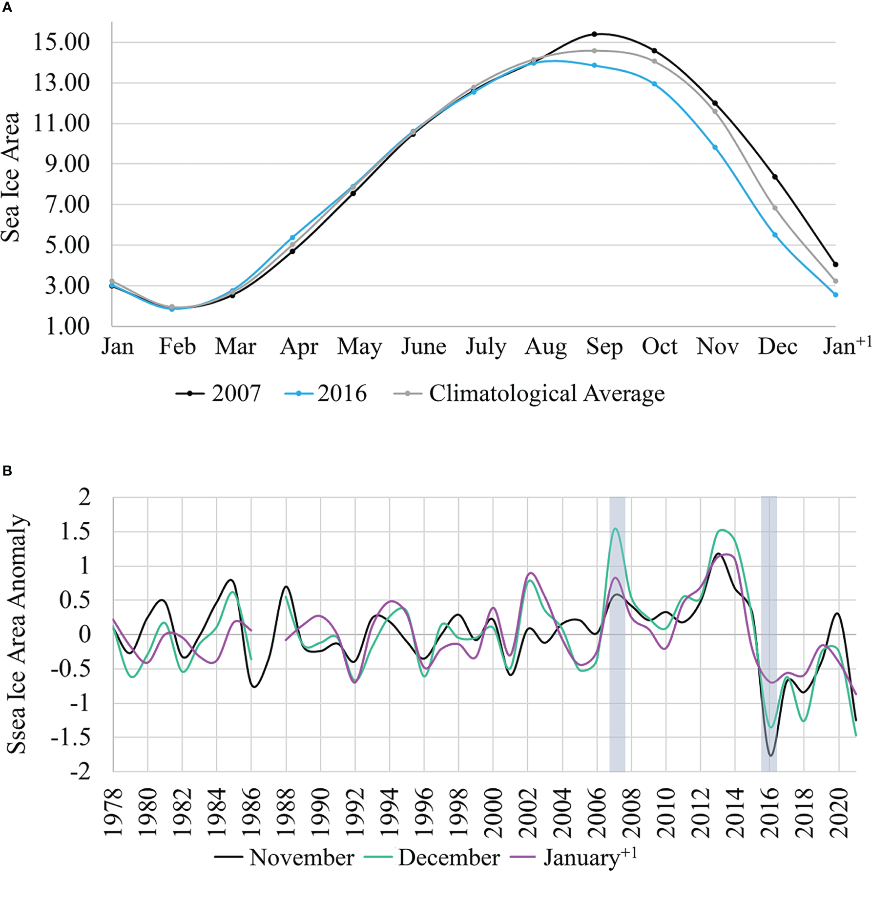 (A) Monthly sea ice area [million km2] from 2007, 2016 and on average from the 1979 – 2021 record. (B) Sea ice area anomaly (million km2) from the mean ice area record in November, December, and proceeding January (austral summer). The winters of interest (2007 and 2016) are shaded gray.