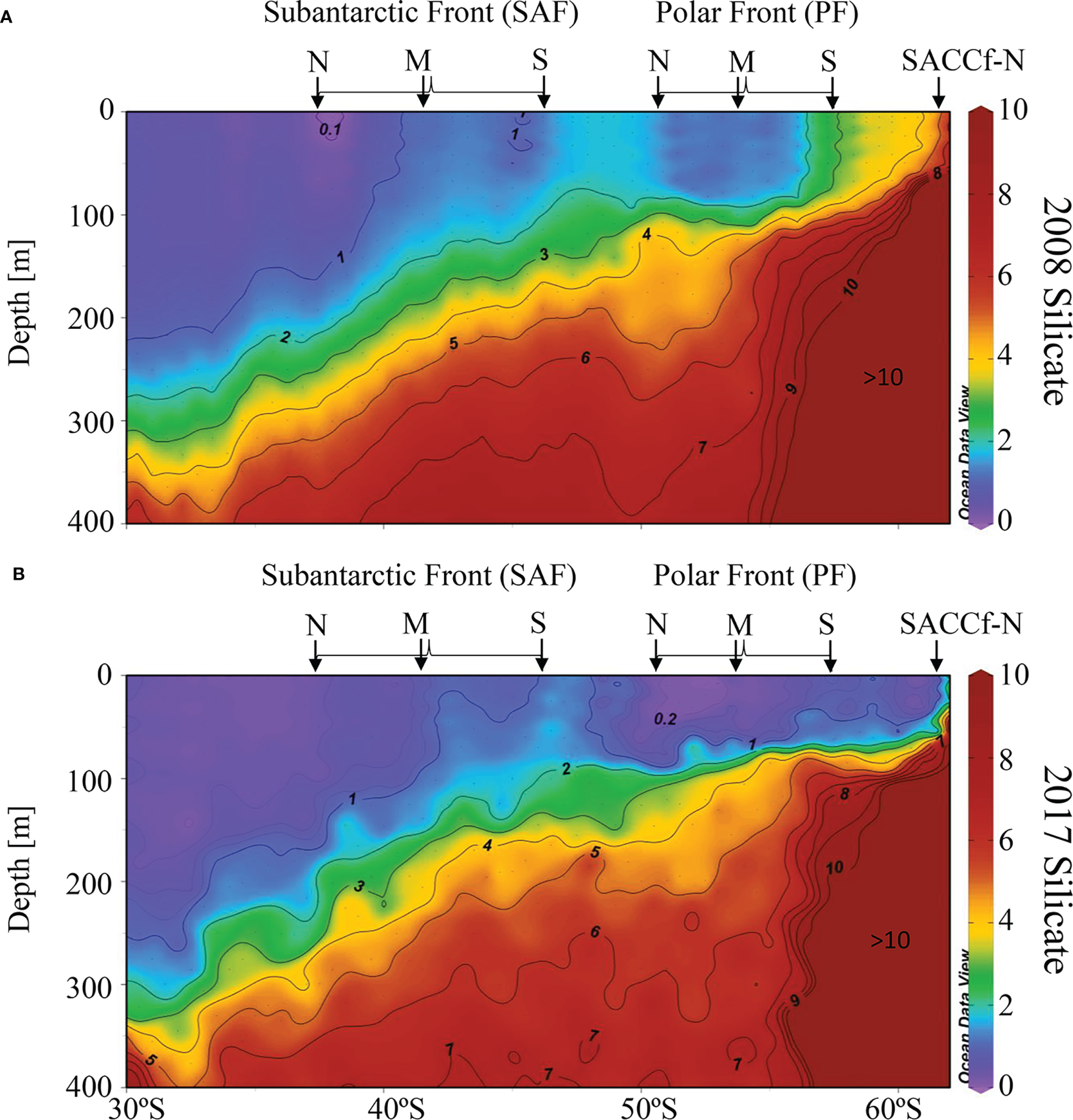 Upper ocean (<400 m) silicic acid concentrations [µmol kg-1] normalized to a salinity of 35 in (A) January 2008 and (B) January 2017 along P18 occupations (103°W).