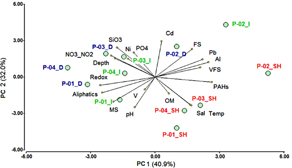 Principal component analysis of environmental variables through campaigns and sampling zones. Labels P-01, P-02, P-03, and P-04 indicate the campaign, followed by the sampling zone: shallow (SH) in red, intermediate (I) in green, and deep (D) in blue. Sampling zone categories were defined according to the total water depth of each sampling site. SH sites: ≤200 m, I sites: 201-1200 m, and D sites: 1201-3573 m.