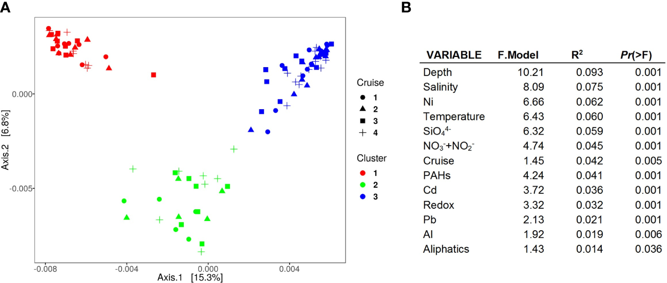 Community structure analysis grouped the samples into three clusters (Figure 3A) differing in terms of the water depth (R2 = 0.56, F2,102 = 64.48, P<0.0001) at which the analyzed sediments were collected. In P-01 the samples were clustered following a clear bathymetric gradient; cluster I included the samples collected from 44 to 107 m of the water column, cluster II the sediments collected from 372.5 to 826 m of water, and cluster III the samples collected from 1000 to 3548 m of water (Supplementary Figure 2). Based on the community structure analysis, 17 of 27 samples showed temporal stability, since they were in the same cluster campaign after campaign (Figure 4; Supplementary Figure 2). The remaining 10 samples showed community structure shifts, and thus, they were grouped in different clusters in some campaigns. Most of these 10 samples were in transect D, which showed larger differences than the others, especially in P-02 and P-03 compared with P-01 (Supplementary Figure 2). Cruises, water depth, temperature, salinity, + , , redox potential, the concentration of Ni, Cd, Pb, and Al, and the content of aliphatic and aromatic hydrocarbons were related to community structure changes. Nonetheless these parameters explained only a small proportion of these changes (Figure 3B).