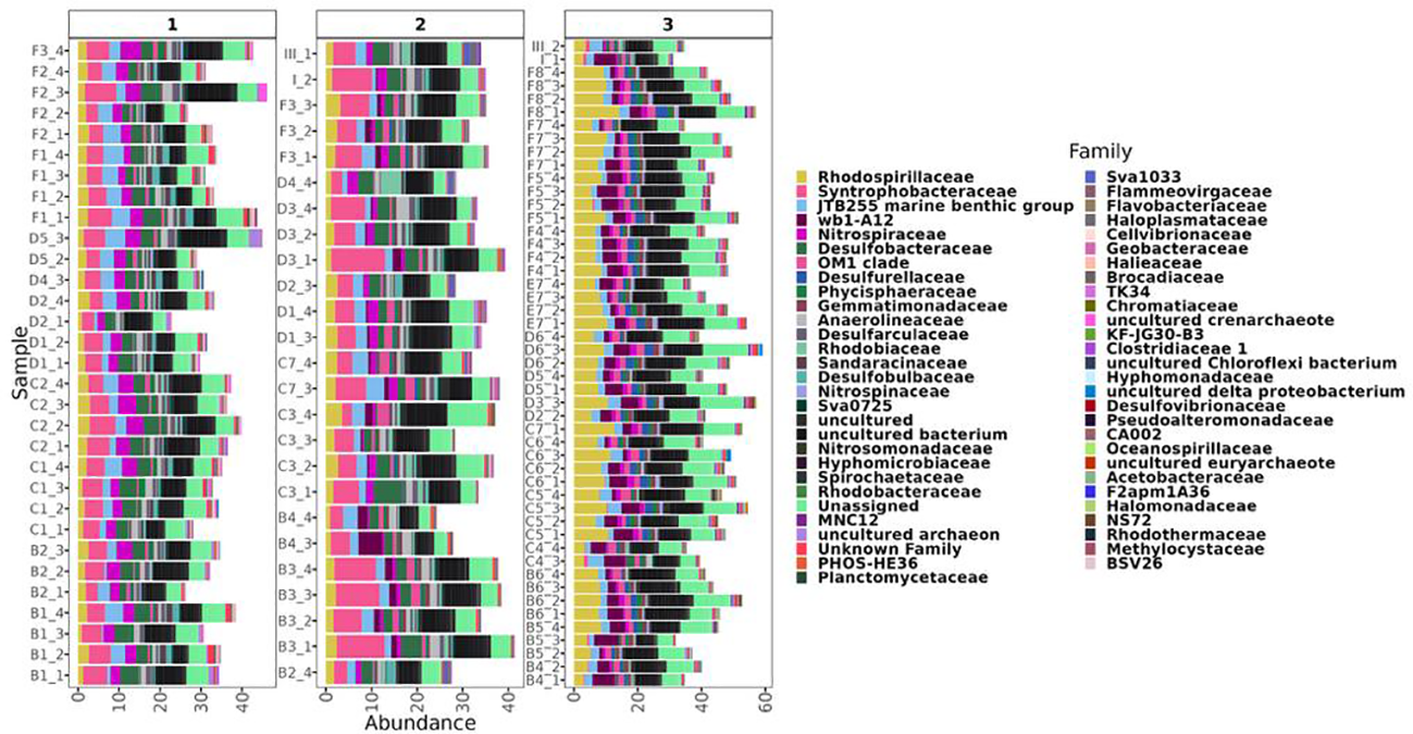 Proteobacteria was the dominant phyla in all the sites among cruises. At this taxonomic level Acidobacteria, Chloroflexi, Planctomycetes, Nitrospirae (Nitrospirota), Gemmatimonadetes, Actinobacteria, Bacteroidetes, and Bathyarchaeota were detected in high abundances in the studied region (Supplementary Figure 4). The most abundant microbial classes were represented by Deltaproteobacteria, Gammaproteobacteria, Alphaproteobacteria, Nitrospira, and Dehalococcoidia; although SAR202, Phycisphaere, Anaerolineae, and Gemmatimonadetes showed high relative abundances in microbial communities (Supplementary Figure 5). At the family taxonomic level Syntrophobacteraceae, Rhodospirillaceae, Nitrospiraceae, OM1 clade, JTB255 marine benthic group (abbreviated JTB255 MBG), Desulfobacteraceae, Desulfobulbaceae, Anaerolinaceae, and Desulfurellaceae were among the most abundant groups detected across campaigns (Supplementary Figure 6).