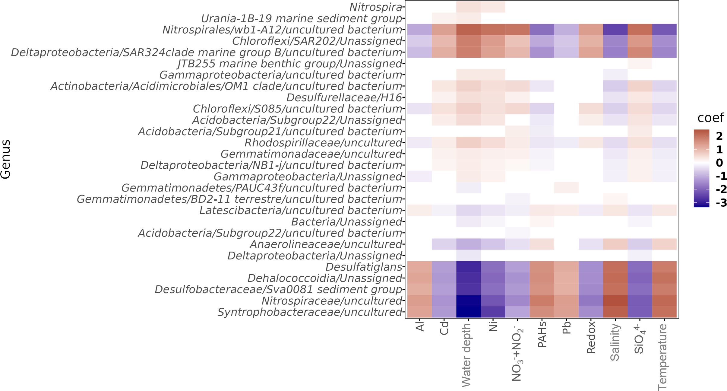 Analysis of multivariable association of microbial features revealed 25 genera correlated with specific environmental parameters (Figure 5). The correlation of environmental variables with specific taxa was done at genus level because this kind of analysis must be performed at the lower taxonomic level to secure correspondence between metabolisms related with the environmental parameters. ASVs affiliated to Desulfatiglans and Sva008, as well as ASVs affiliated to uncultured bacteria from Syntrophobacteraceae, Latescibacteria, Anaerolineaceae, Nitrospiraceae, and an unassigned Dehalococcoidia genus were positively related with temperature, salinity, and the content of Pb, Al, and PAHs (Figure 5). ASVs affiliated to wb1-A12, Rhodospirillaceae, Chloroflexi classes SAR202 and S085, NB1-j and SAR324 clade marine group B from Deltaproteobacteria, Acidobacteria class Subgroup22, Gemmatimonadaceae, Actinobacteria clade OM1, and the Desulfurellaceae genus H16 were positively related with water depth, + , , redox, Cd, and Ni (Figure 5).