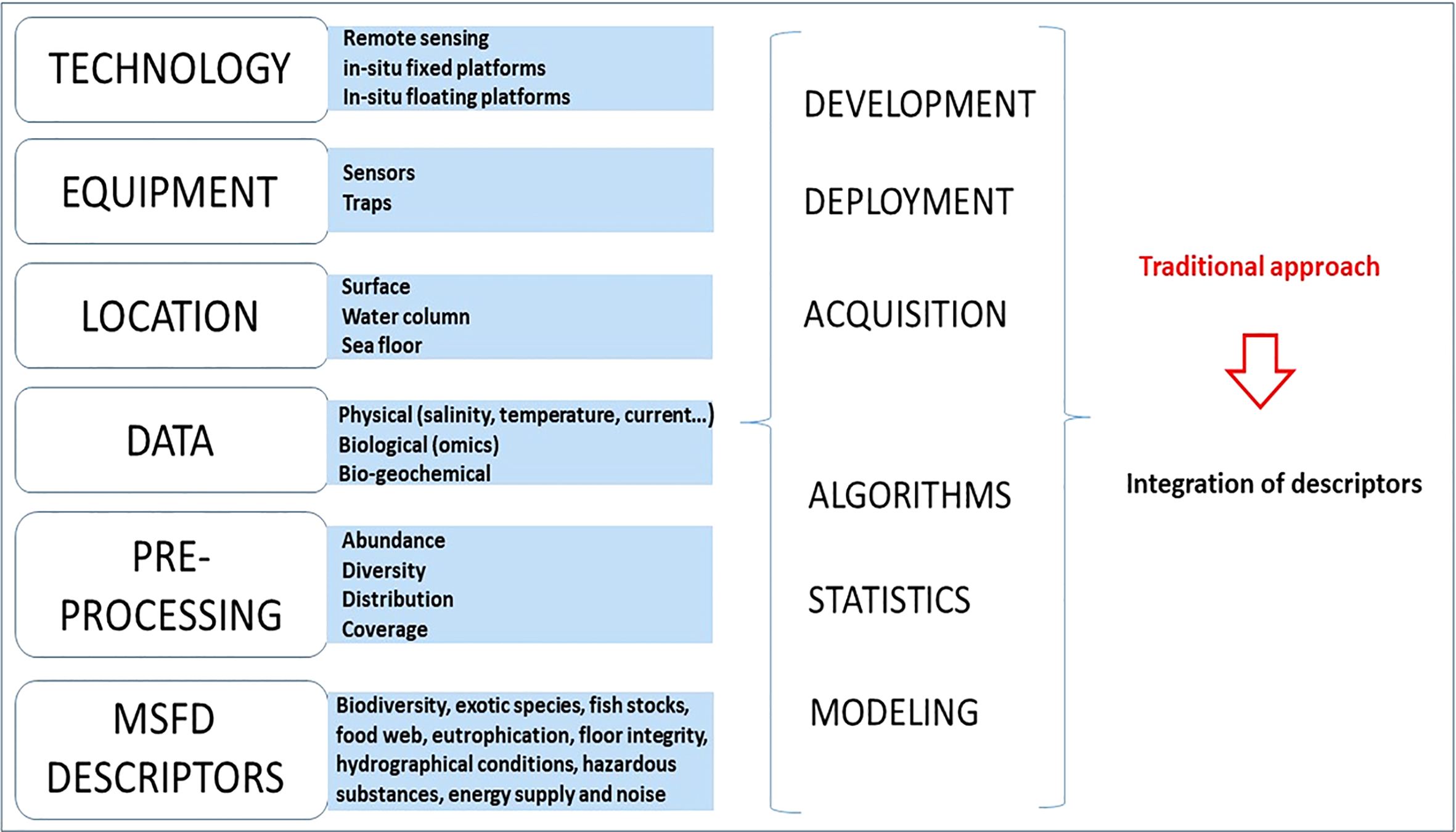 Figure 1 shows a framework in use to address the state of the marine environment. While dealing with many variables and approaches, the acquired data often captures specific environmental aspects that are then analyzed by very different models (a comprehensive list of marine data and algorithms (with software) is available at https://www.seadatanet.org). In 2018, a survey on biological ocean observation completed by more than 100 observing program leaders/managers reported that two thirds of the observing programs provided the abundance, diversity, distribution and coverage as indicators of the marine ecosystem (Miloslavich et al., 2018).