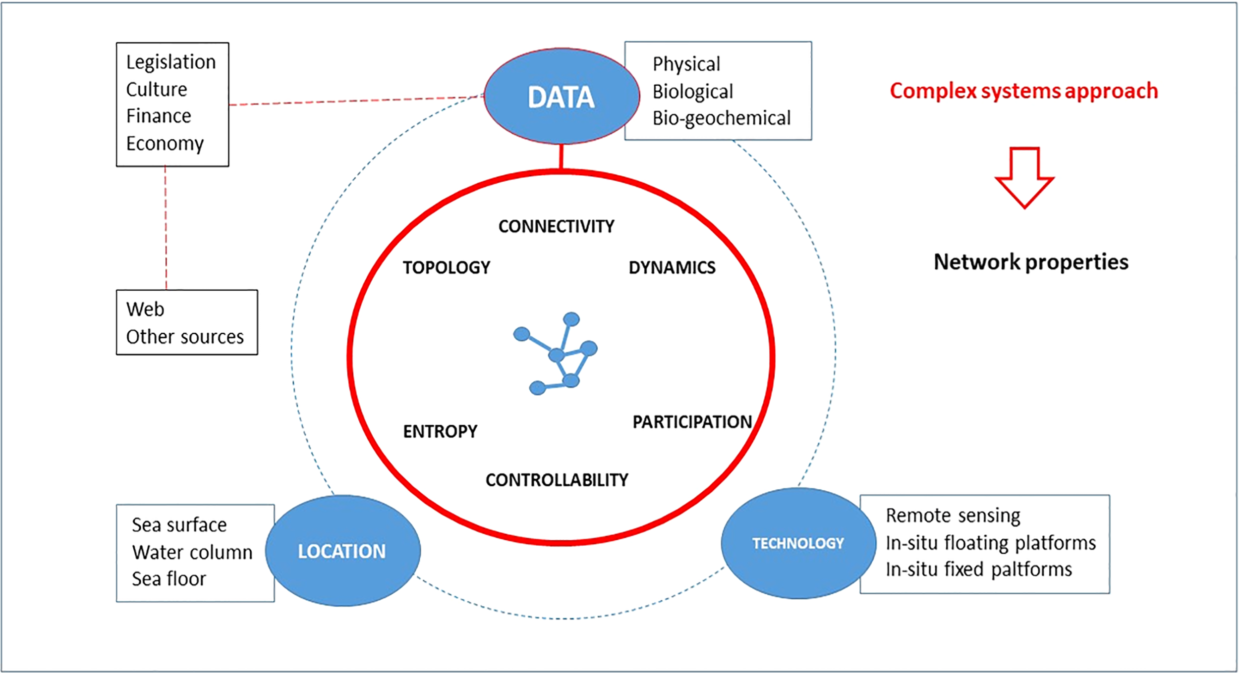 However, the diversity of environmental contexts often does not allow to adopt a common and comprehensive model. We need therefore to identify an analytical framework capable to describe the dynamics of a network of inhomogeneous agents, preferably not limiting the ecosystem to the physical or biological variables of the marine environment (Miloslavich et al., 2018; Affatati and Moretti, 2021). Examples come from sectors such as soil (Masciandaro et al., 2013) or freshwater (Van Rossum et al., 2018) indicate the possibility of simplifying the evaluation of the state of the system by reducing the number/volume of data to be acquired, thus making more feasible the system’s state monitoring and management.