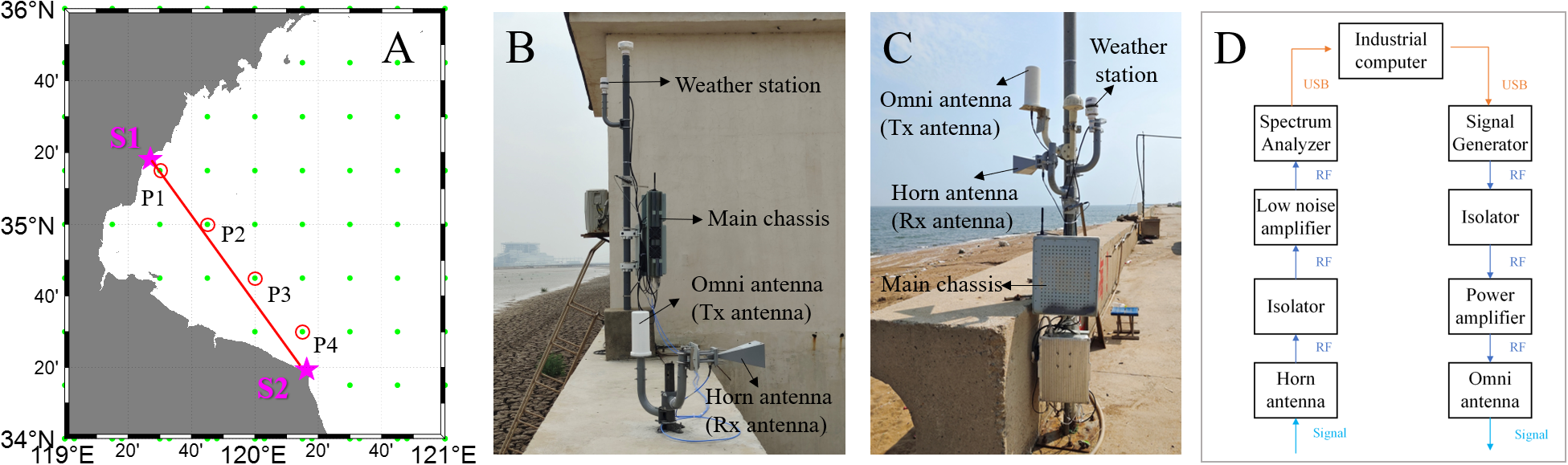 (A) Propagation path (red line), the positions of the transmitter and receiver (pink pentagrams) and reanalysis data grid points (green points and red circles), (B) transmitter (S2), (C) receiver (S1), (D) measurement system schematic.