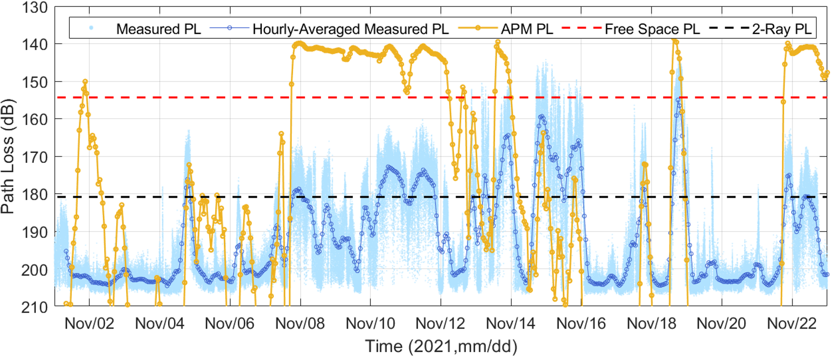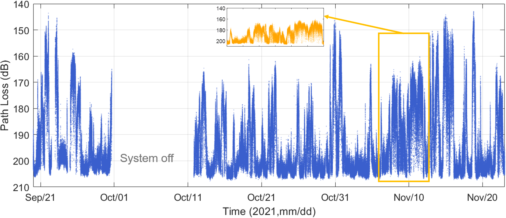 Table 2 presents some basic statistical characteristics of the measured PL, and Figure 4 shows the empirical CDF of the measured PL during different months. With the maximum measurable power loss of 200 dB, our measurement system connected with a probability of 52.6% during the measurement period. The PL higher than 200dB was noise, and we only show the CDF of PL below 200dB. The PL distribution of three months in autumn is basically the same as shown in Figure 4. The probabilities of PL of less than 200 dB were 85.9% in September. However, since the measurement in September started on September 20, 2021, and only lasted for about 10 days, the statistical results of this month may not be representative. The probabilities of PL of less than 200 dB were 48.2% in October, and 53.2% in November, respectively. The mean values of PL were 189 dB in September, 195 dB in October, and 192 dB in November, respectively. The probabilities of PL of less than 200, 190, 180, and 170 dB during the measurement period were 52.6%, 31.3%, 18.5%, and 7.3%, respectively.