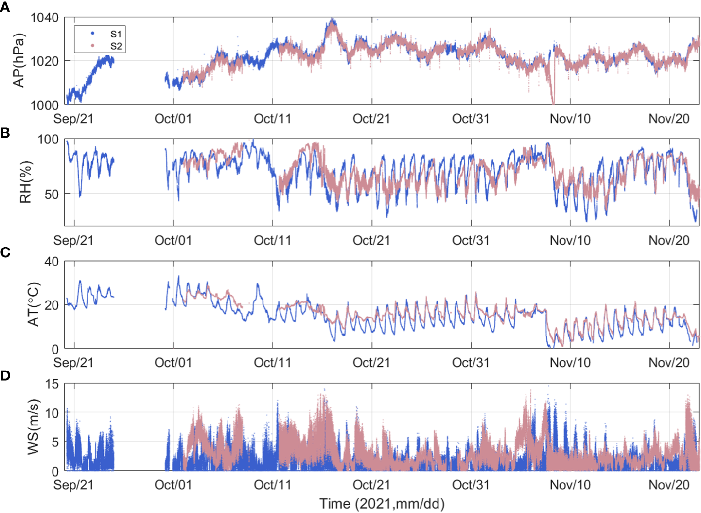 Figure 3 shows the temporal evolutions of AP, RH, WS, and AT measured by the automatic weather stations installed at S1 and S2. It can be seen that the atmospheric parameters also fluctuated greatly with time. As shown in Figure 3A, the monitored AP was broadly similar at both locations. The RH and AT showed strong diurnal variation characteristics, as shown in Figures 3B, C, respectively. The RH varied greatly with values as low as 23% and as high as 98%. Generally, RH was low during the day and high at night, which might be attributable mainly to the light. The AT also exhibited strong diurnal variation with high temperatures during the day and low temperatures at night. The mean values of the measured AT were 23.3, 16.2, and 11.5 °C during September, October, and November, respectively, showing a general trend of decrease toward winter. As shown in Figure 3D, WS also varied greatly with values as low as 0 m/s and as high as 20 m/s, which would have marked influence on the evaporation of seawater. Overall, a large number of measured data were recorded, and both the PL and the meteorological parameters varied substantially.