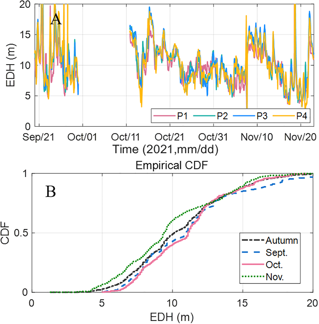 The evaporation duct distributions during the measurement period were obtained using the ECMWF ERA5 reanalysis data. It can be seen from Figure 5A that EDH varied dramatically during the measurement period. However, there was little difference in EDH at different positions along the link, which reflects characteristics of horizontal inhomogeneity. The reason that PL distribution is basically the same in autumn is that the climatic conditions are basically the same, which leads to similar distribution of EDHs. Table 2 presents some statistical characteristics of the simulated EDH at P3 during the measurement. The mean EDHs were 11.5m in September, 11.1 m in October, and 9.9 m in November. Variations in EDH over the ocean come primarily from variations in four environmental parameters: SST, AT, RH, and near-surface WS. The regular monthly variation of environmental parameters leads to the monthly variation of the EDH to be general, except in some extreme weather conditions. The mean value of EDH at P3 during the measurement period was 10.6 m, which was relatively low. This led to a small probability of communication via the over-the-horizon link in autumn. Figure 5B shows the empirical CDF of EDH at P3 during the measurement period. The probabilities of EDH greater than 5, 10, and 15 m during the measurement period were 97.2%, 50.7%, and 11.9%, respectively.