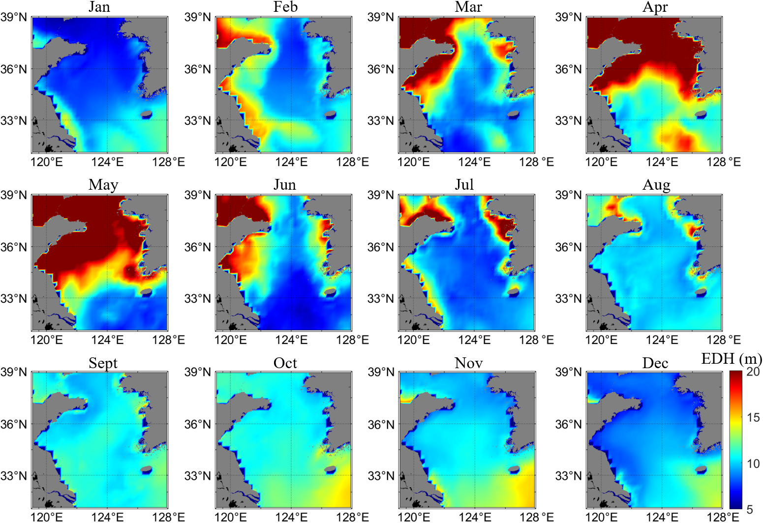 The temporal and spatial distribution characteristics of evaporation duct show strong differences in different sea areas (Shi et al., 2015b; Sirkova, 2015; Yang et al., 2016; Zhang et al., 2016; Yang et al., 2022a; Huang et al., 2022). Lying between mainland China and the Korean Peninsula, the Yellow Sea is one of the largest areas of continental shelf shallow water that provides rich fishing grounds and oil resources. The channel characteristics of evaporation duct over the Yellow Sea has been seldom reported. This paper presents long-term measurements of over-the-horizon microwave propagation in evaporation ducts over the Yellow Sea in 2021. The X-band EM propagation systems, deployed in coastal areas of the Yellow Sea, recorded valid EM propagation data of a 133-km-long (7.7 times the line-of-sight length) link over a 54-day period in autumn. The EM propagation characteristics were analyzed on the basis of statistical analysis and model simulations. The results are important with regard to the development and application of over-the-horizon maritime broadband communication. The remainder of this paper is structured as follows. Section 2 presents details of the measurement campaign and outlines the methods used to study the effects of evaporation ducts on EM propagation. In Section 3, the measured data and their statistical properties are analyzed. Evaporation duct climatology during the measurement period and the effects of evaporation ducts on EM propagation based on model simulation are also presented in Section 3. The annual variation of evaporation ducts and the monthly average EDH distributions in the Yellow Sea are discussed in Section 4. Finally, the derived conclusions are presented in Section 5.