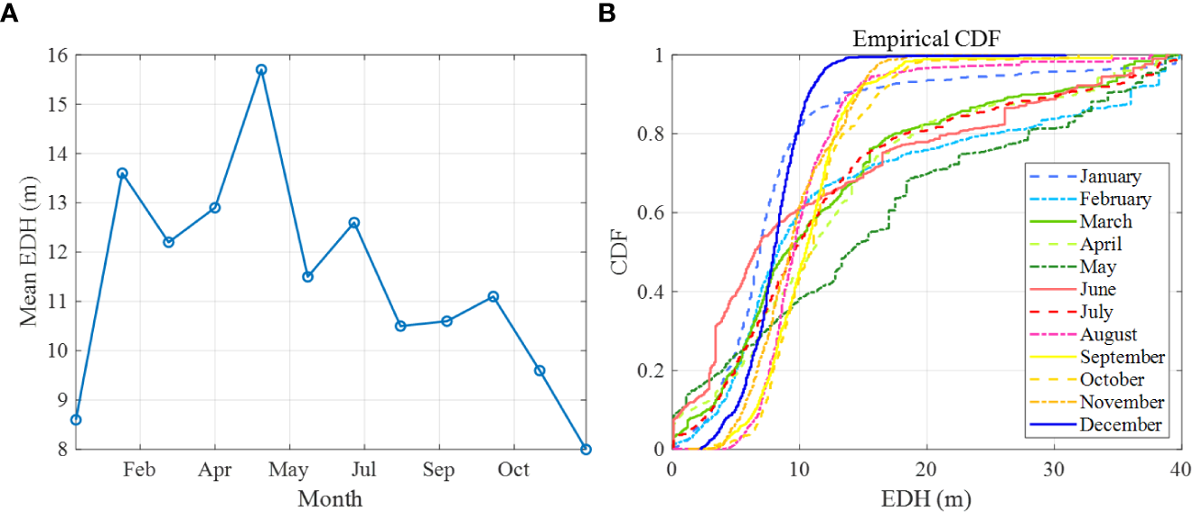 (A) EDH distribution and (B) empirical CDF of EDH at P3 during the measurement period.