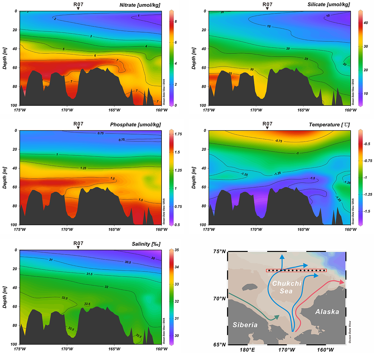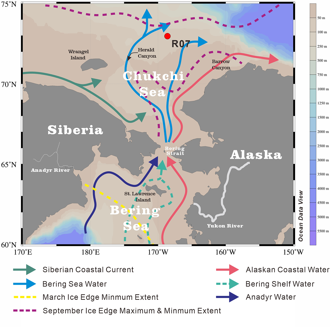 The Chukchi Sea has an area extent of 6.20 × 105 km2 (Jakobsson, 2002), representing a shallow (average depth of 50 m) (Baskaran and Naidu, 1995) and seasonally ice-covered continental shelf of the Arctic Ocean (Grebmeier et al., 2006). Owing to the pressure-head difference between the Pacific and Arctic oceans, the annual average northward transportation of Pacific water through the Bering Strait to the Chukchi Sea is approximately 1.0 Sv (1×106 m3/s), with the maximum (minimum) transport in summer (winter) (Woodgate et al., 2012; Woodgate, 2018). In the Chukchi Sea, the water masses from the Bering Sea bifurcate into the Alaskan Coastal Water (ACW) and Bering Sea Water (BSW) (Coachman et al., 1975; Hunt et al., 2013; Figure 1). The ACW originates from the south of the Aleutian Islands, and is augmented by river runoff (especially the Yukon River) from western Alaska (Steele et al., 2004). This nutrient-limited, warm (1°C< T< 6°C) and fresh (31‰< salinity< 32‰) ACW flows along the coast of Alaska to Barrow Canyon (Steele et al., 2004). The BSW, which is relatively nutrient-rich, cold (summer temperature of 0°C ~ 2°C) and saline (summer salinity of 32‰ ~ 33‰), further splits into two branches during its northward flow (Steele et al., 2004; Hunt et al., 2013). One branch, with some mix into the ACW, continues flowing northward between shoals via the Central Channel (Steele et al., 2004; Weingartner et al., 2005), while the other branch mixes with the cold and fresh Siberian Coastal Current (Weingartner et al., 1999), and flows northwest into the Herald Valley to the east of the Wrangel Island (Coachman et al., 1975). After passing the Herald Valley, the water spreads northeastward to the north-central shelf and eastward along the north of the Herald Shoal (Weingartner et al., 2005). Carrying nutrients, heat and freshwater into the Chukchi Sea, these Pacific-origin water masses significantly impact biological and physical processes in the area (Hill et al., 2005; Weingartner et al., 2005; Grebmeier et al., 2006). For example, under the influence of these water masses, the nutrient concentration (nitrate, phosphate and silicate), salinity and temperature show distinctly different characteristics along the 73°N transect where the study core (R07) is located (Figure 2).