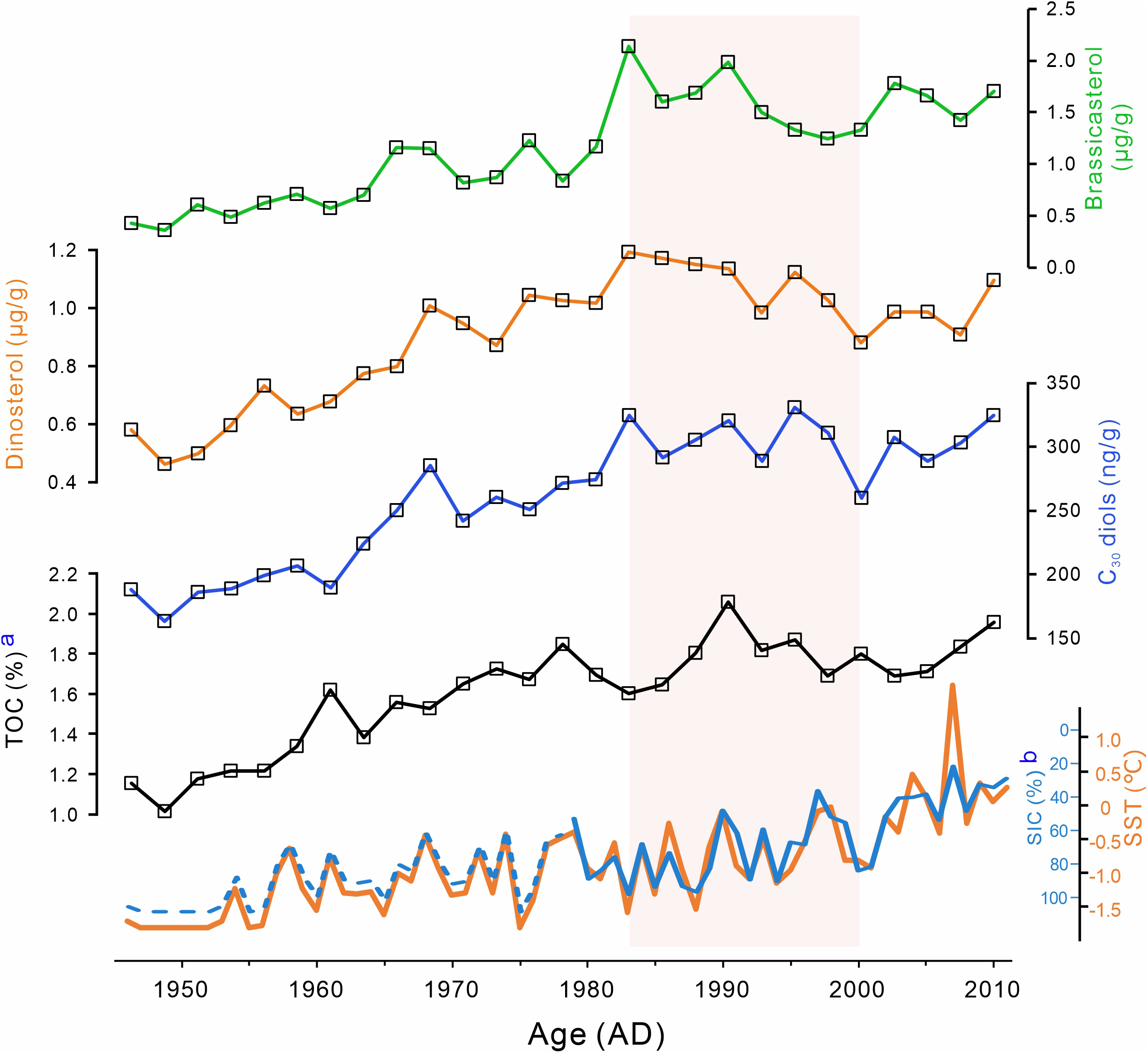 Temporal variations in concentrations of brassicasterol, dinosterol, and C30 diols, TOC from R07, and SST/SIC at the study area. a. TOC from Zhang et al. (2018); b. The blue solid line represents the download satellite SIC data, and the blue dash line represents the SIC data calculated based on SST. The satellite SIC data are from the National Snow and Ice Data Center (NSIDC; Cavalieri et al., 1996). Historical SST data were obtained from the NOAA ERSST V5 (https://www.esrl.noaa.gov/psd/data/gridded/data.noaa.ersst.v5.html; Huang et al., 2017).