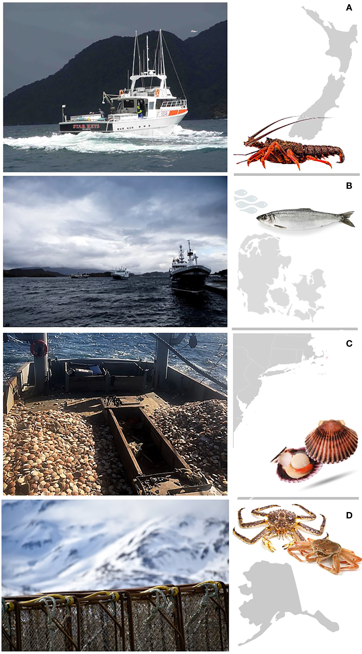 Cooperative research efforts in fisheries detailed in case studies in the Lowell Wakefield Symposium, including (A) New Zealand rock lobster fisheries, (B) North Sea small pelagic fisheries for herring, smelt and sandeel, (C) Northwest Atlantic scallop fisheries, and (D) Alaska groundfish and crab fisheries. Photo credits: D.R. Sykes, C.R. Sparrevohn, B. Eilertsen, and M.R. Baker.