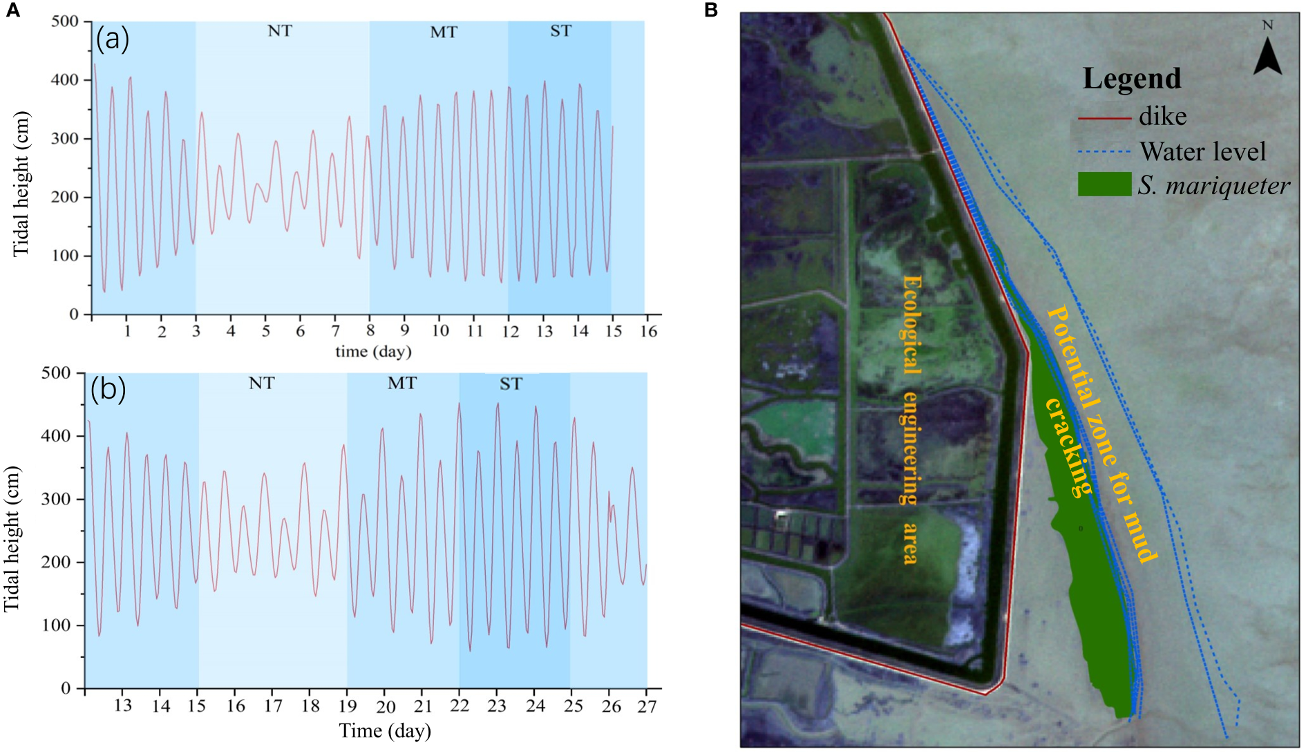 Tidal heights and tidal regimes in the Chongming Dongtan wetland. (A) Variations in tidal heights in April 2021 (a) and August 2021 (b); NT, MT, and ST are neap tide, middle tide, and spring tide, respectively. (B) Variations in tidal regimes from January to August 2021. The zone between water levels is defined as the potential mud cracking zone and a potential ecological restoration zone for plant dispersal and colonization.