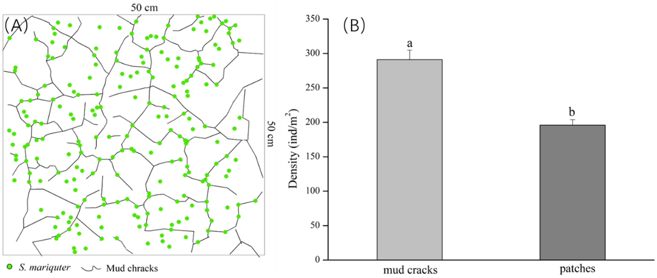 Distribution of S. mariqueter in mud cracks and patches in the study site. (A) An illustration of the distribution patterns of individual plants, and mud cracks: green dots are plants and black lines are mud cracks. (B) Bar graphs showing plant densities in the mud cracks and patches.