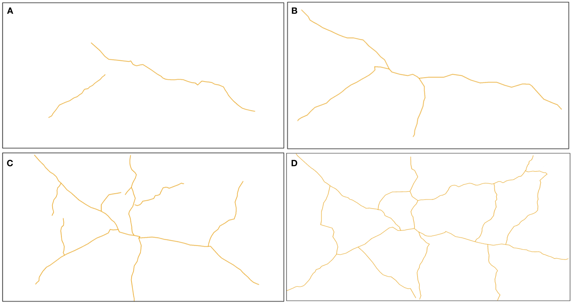 Evolution of mud cracks during the experimental period. (A) Mud cracks at the end of the second CDOE, (B) at the end of the third CDOE, (C) at the end of the fifth CDOE, (D) and at the end of the seventh CDOE. CDOE is consecutive days of emersion.